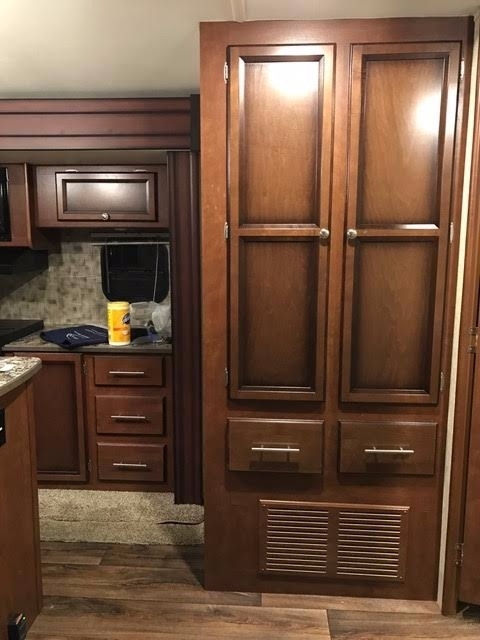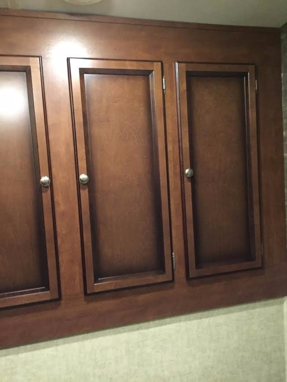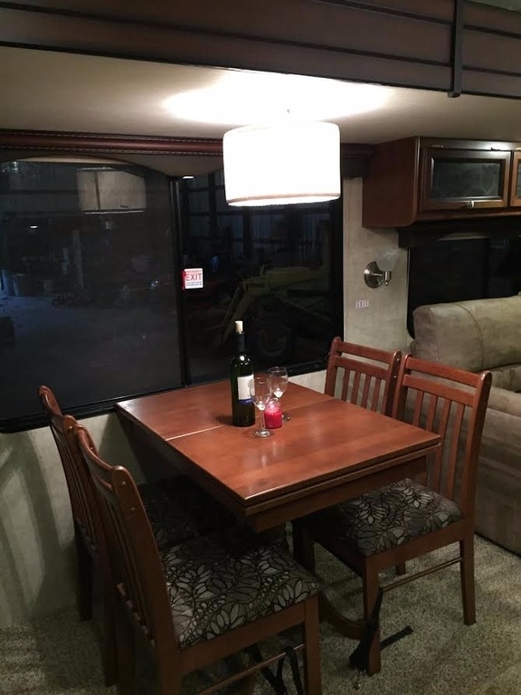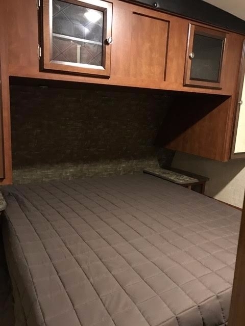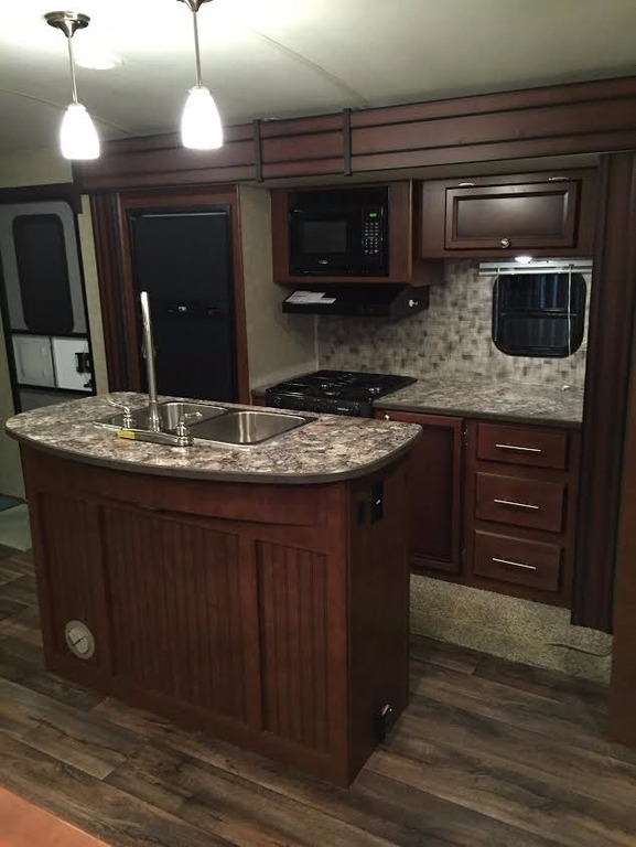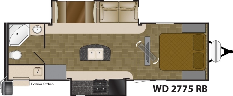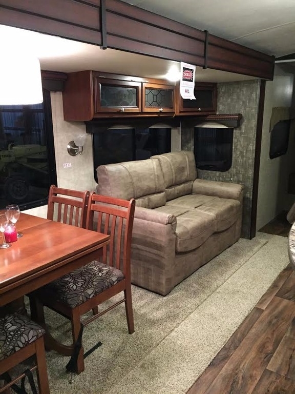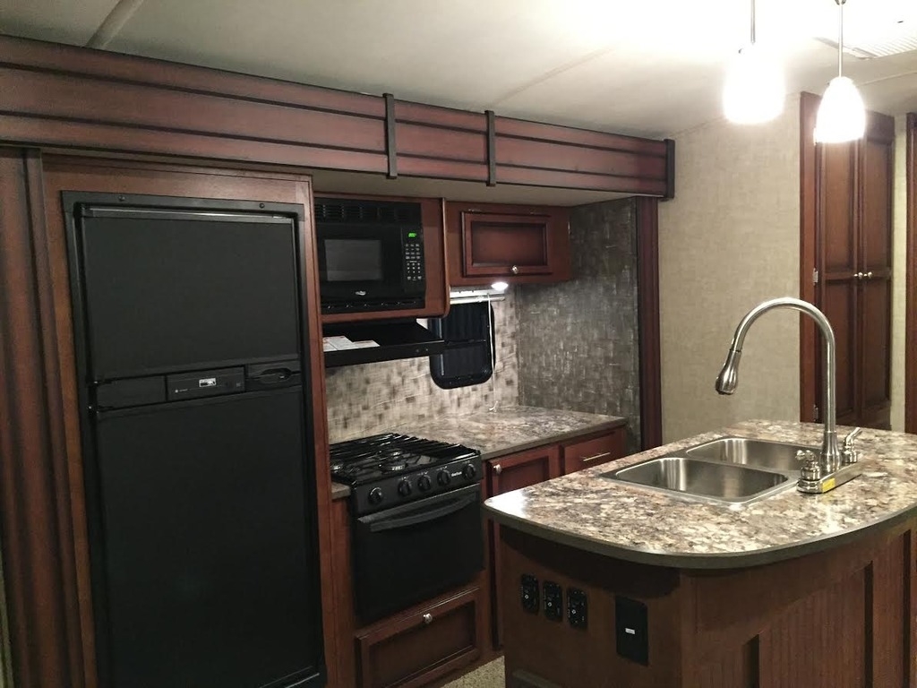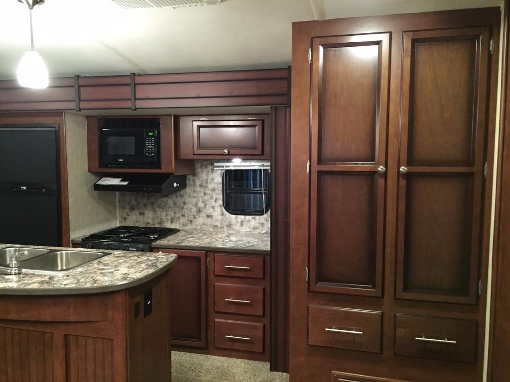It provides a kitchen with efficient wide-open prep areas, as well as large base cabinets and huge overhead storage for that extended vacation. Our three burner range with oven and microwave make meals a snap and huge residential sinks make cleanup a breeze. Enjoy the traditional booth style dinette with a table you can take outside to your patio and exterior kitchen area.