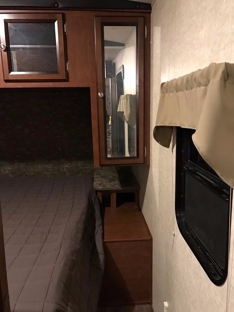 In the bedroom features a Queen size bed with room to walk around, nightstand and reading lights. There are his and her wardrobes along with overheads above the bed. In addition, there is under-bed storage and dresser drawers.