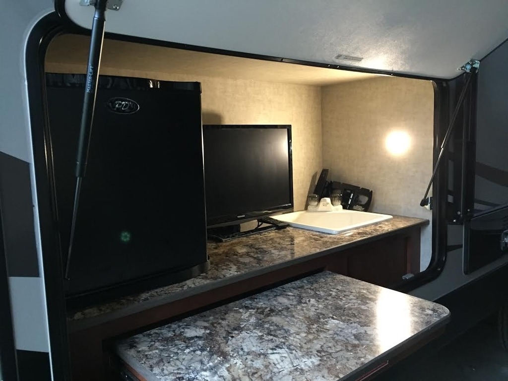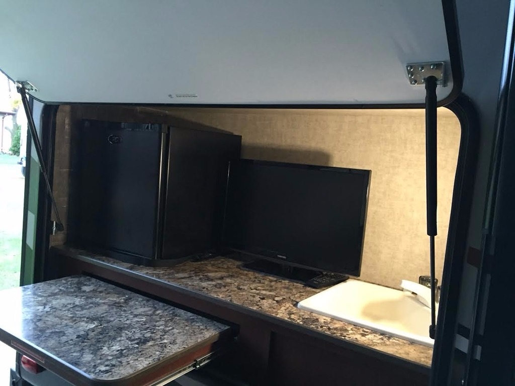 The receiver hitch for the rear bumper and the pivoting grill mount with grill for the exterior kitchen is also included. The camper also has a power jack on the hitch.