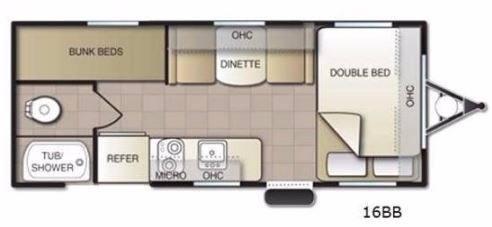 As you enter the Mighty Lite M16BB, there is a double bed with overhead cabinets across the front of this travel trailer.