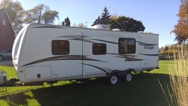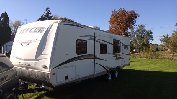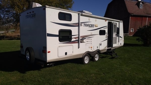You  can easily take your family camping with the Executive Tracer travel trailer.  This travel trailer features a single slide, rear bathroom, and outdoor  kitchen.
