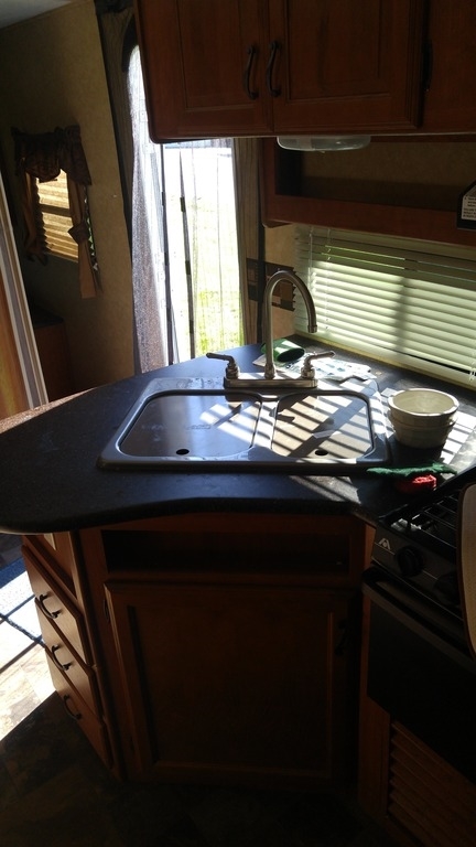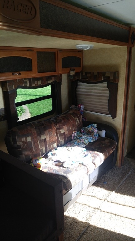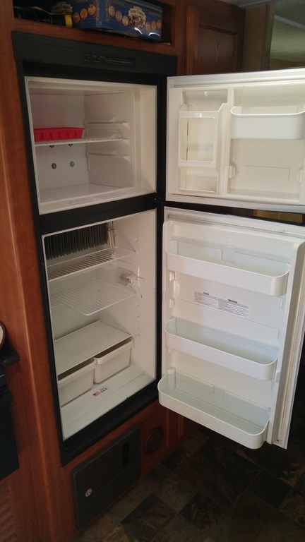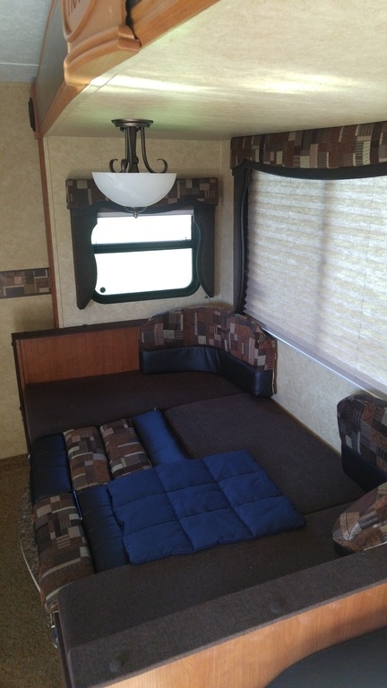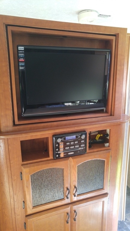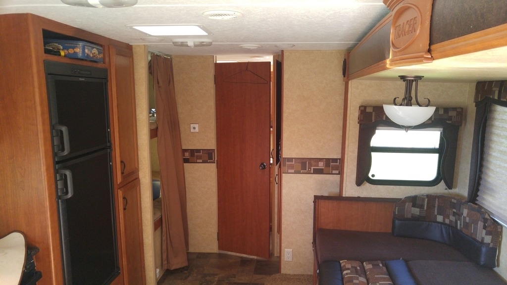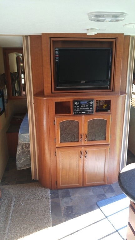 In  the front of the living/kitchen areas you will find a nice size entertainment  center. One side of the trailer has a dinette slide. Next to the slide there is  a large pantry. The opposite side has a double kitchen sink, three burner  range, and refrigerator.