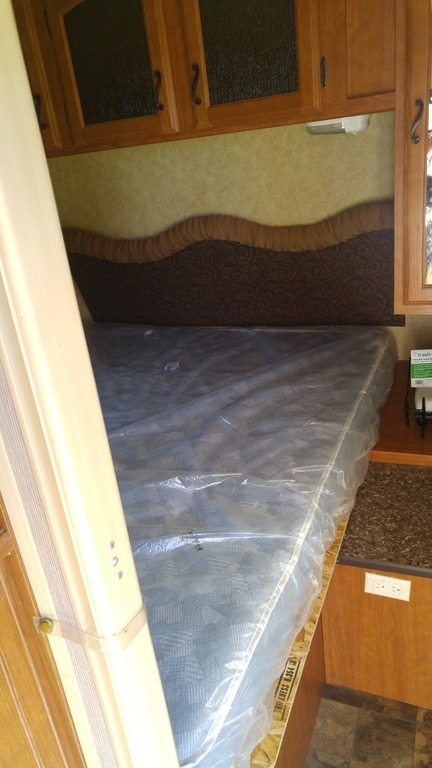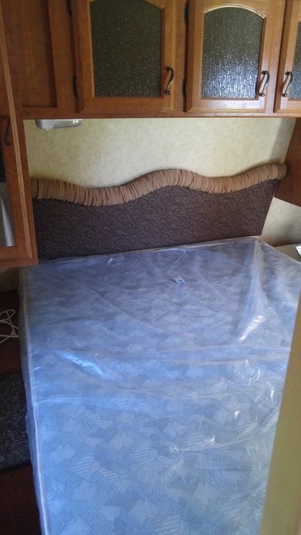 As  you enter the travel trailer to the left there is a front queen bed with shirt  closets on either side of the bed.