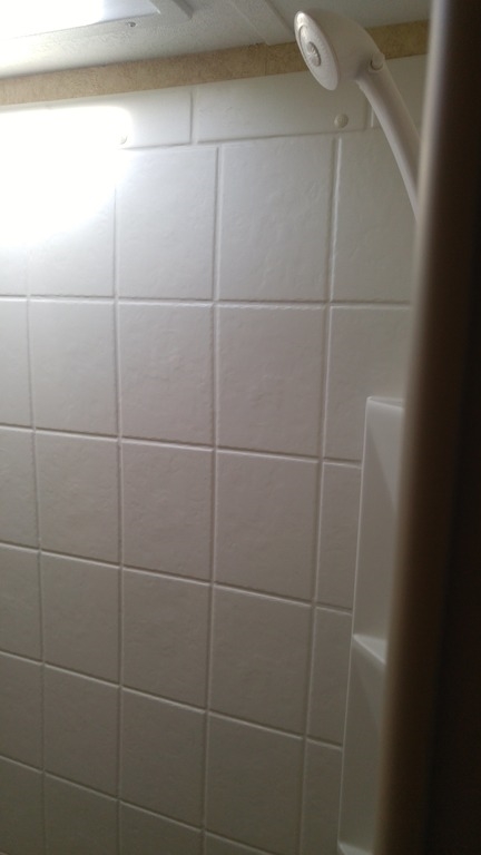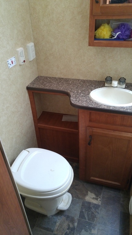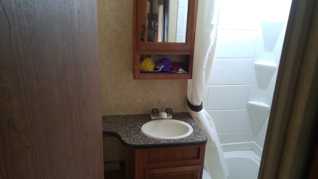 In  the rear you will find the bathroom with a shower, sink, and toilet.