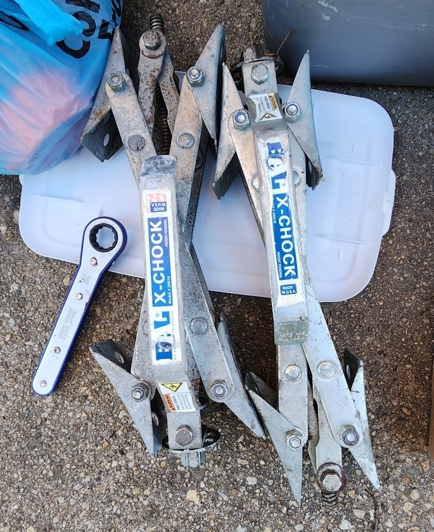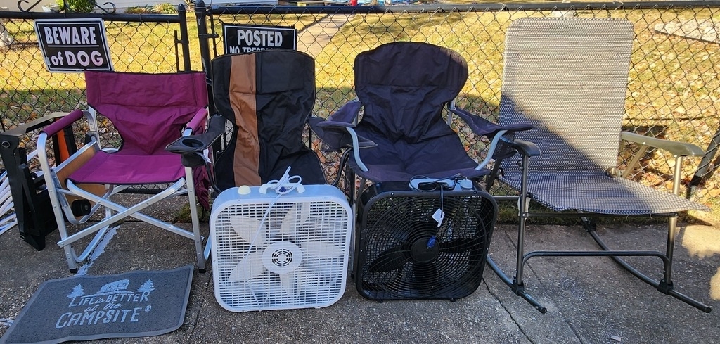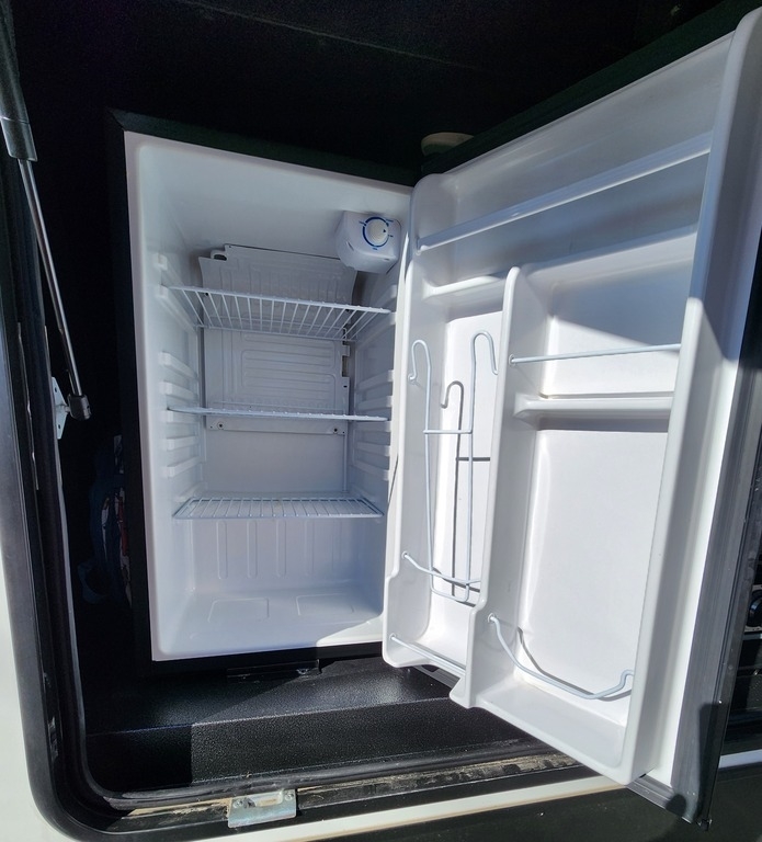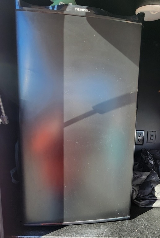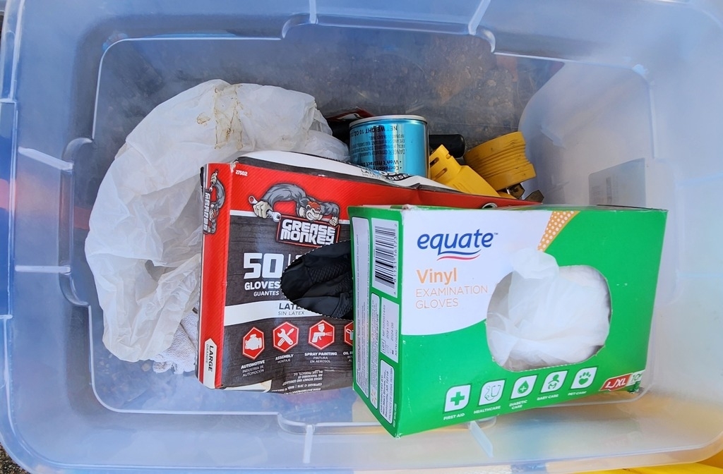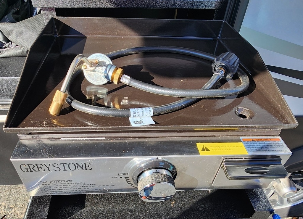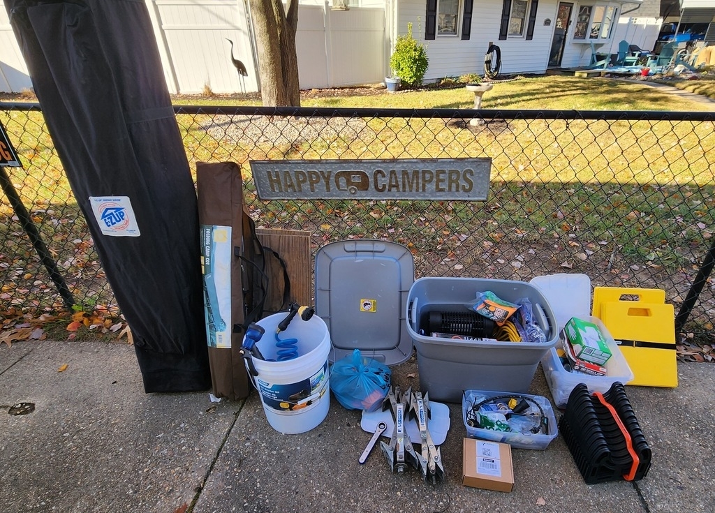 tent, water and sewer hoses, kitchen utensils, an ice maker, coffee pot, and