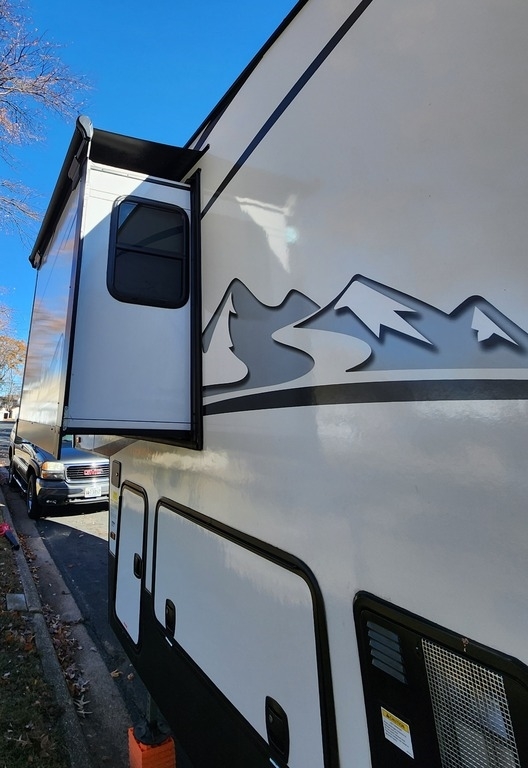 slide-outs with toppers, 1 power retractable awning, 2 A/C units, an outdoor