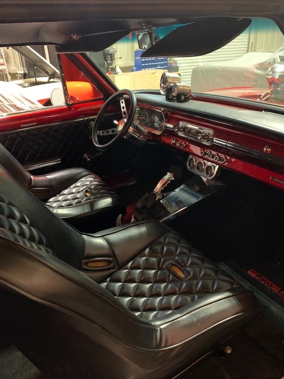 This 1963 Nova is Powered by a Professionally built Blown 355 CID 700HP (on pump gas) V8 Engine, Paired with a Turbo 400 Automatic Transmission. Shown in Custom 3-Stage Candy Apple Red Paint & Black Interior.