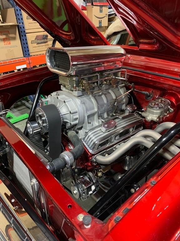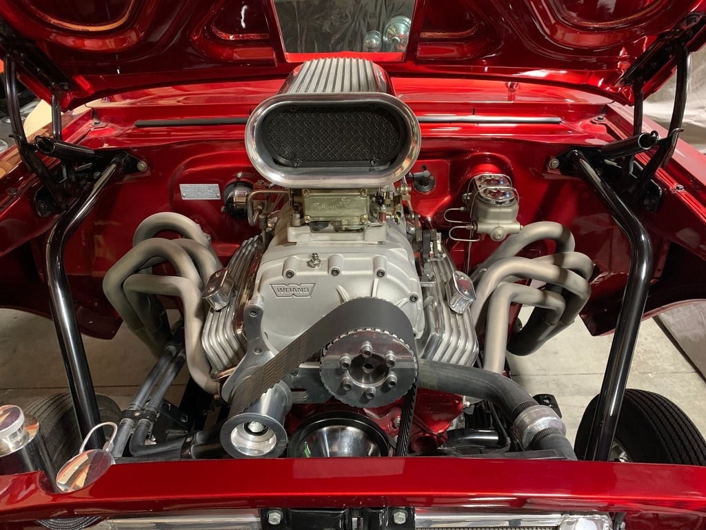 Motor: 355 CID, splayed 4 bolt 327 CID block .030 over, World Products Racing Heads W/SS valves. Crane Gold Roller Rockers, forged crank, solid lifter roller cam, H-beam rods, TRW forged blower pistons. Balanced and assembled with ARP 12PT. bolts and studs. Weiand 671 Blower, Dual 600 Holly carbs with Hooker Thermal Coated fenderwell headers.