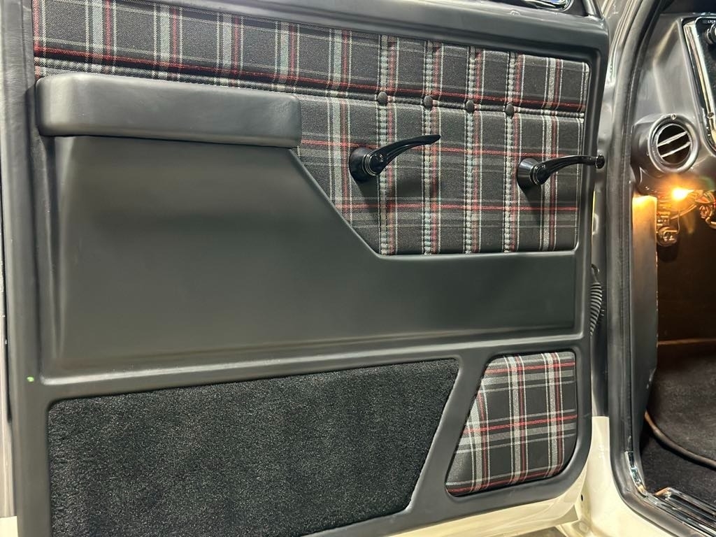 interior covered in leather with cloth inserts. Custom built door panels, kick