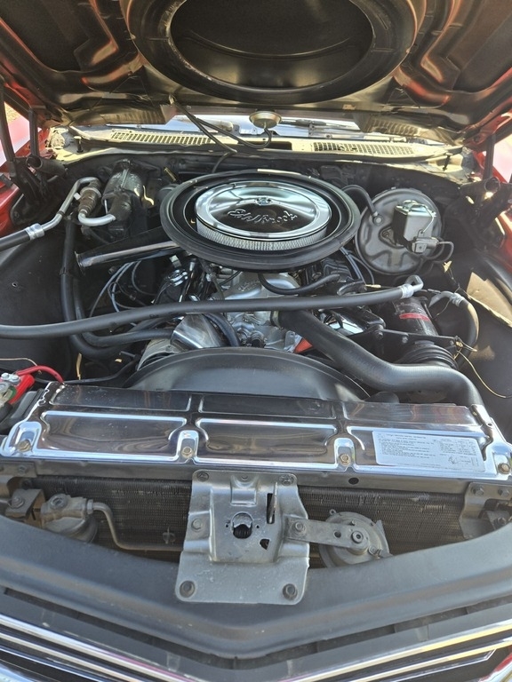 This Chevelle is powered by a 454 V8 engine paired with an automatic transmission. It is shown with a red exterior with white racing stripes and a black vinyl interior. This vehicle has been well-maintained.