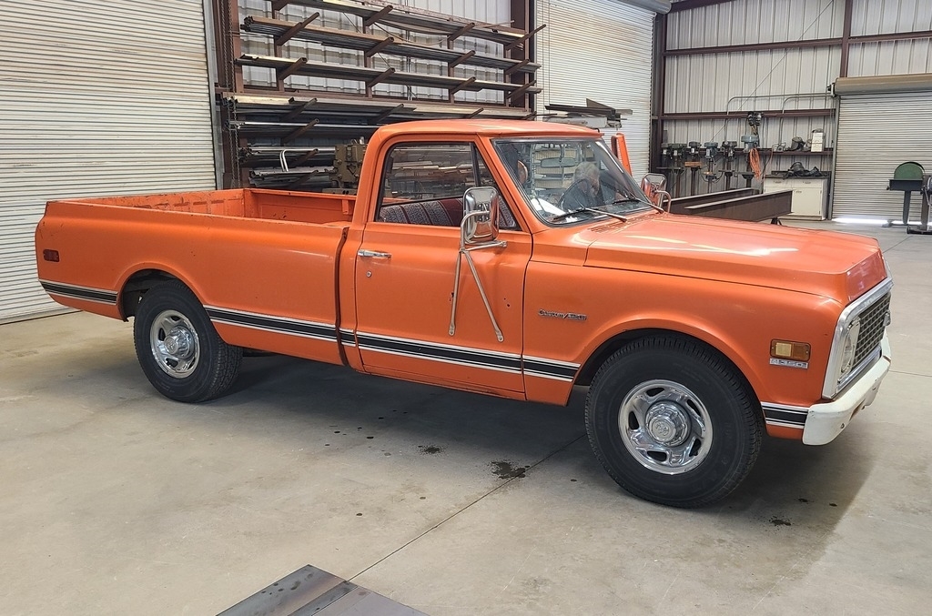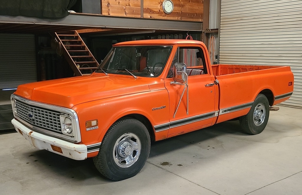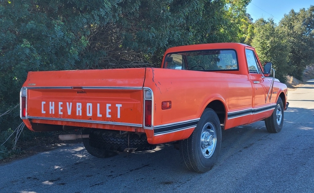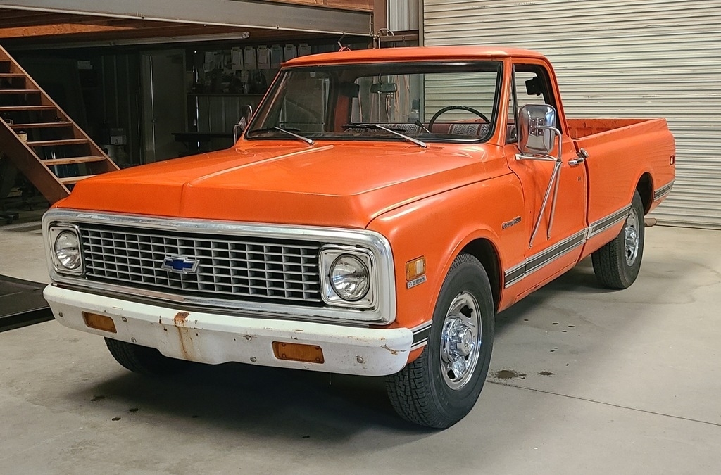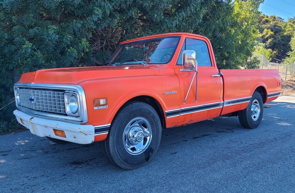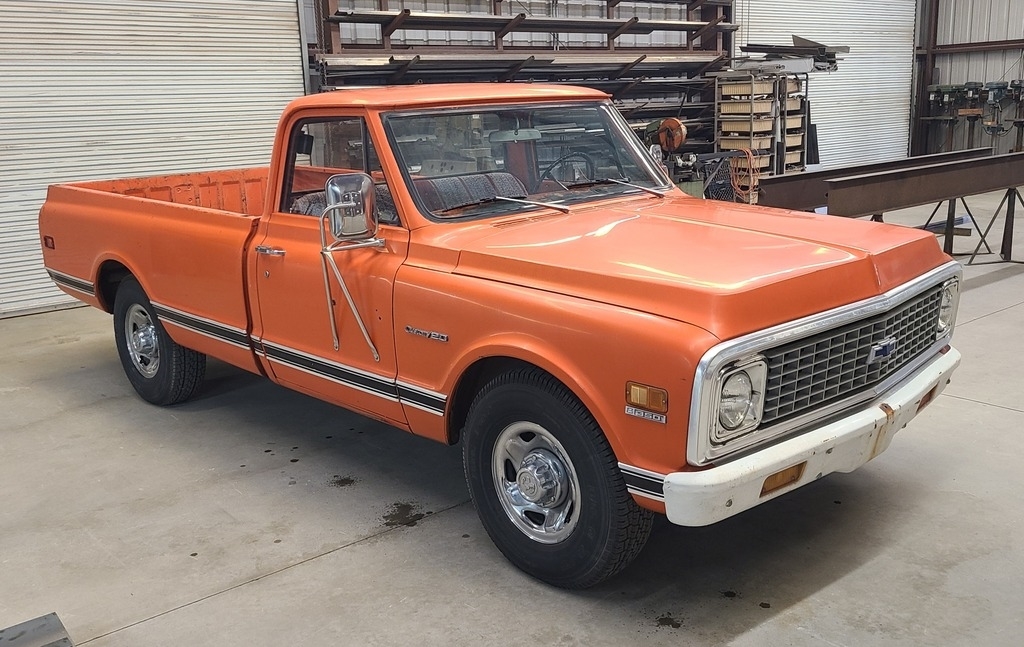 This 1971 Chevy C20 is powered by an 8-cylinder 350 motor and a 3-speed (on the tree) manual transmission with 59,866 miles. Shown with original orange exterior paint and an orange patterned interior.