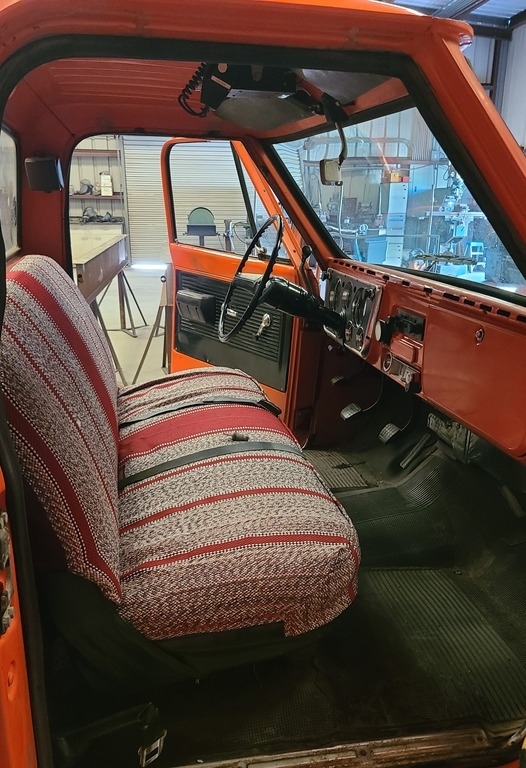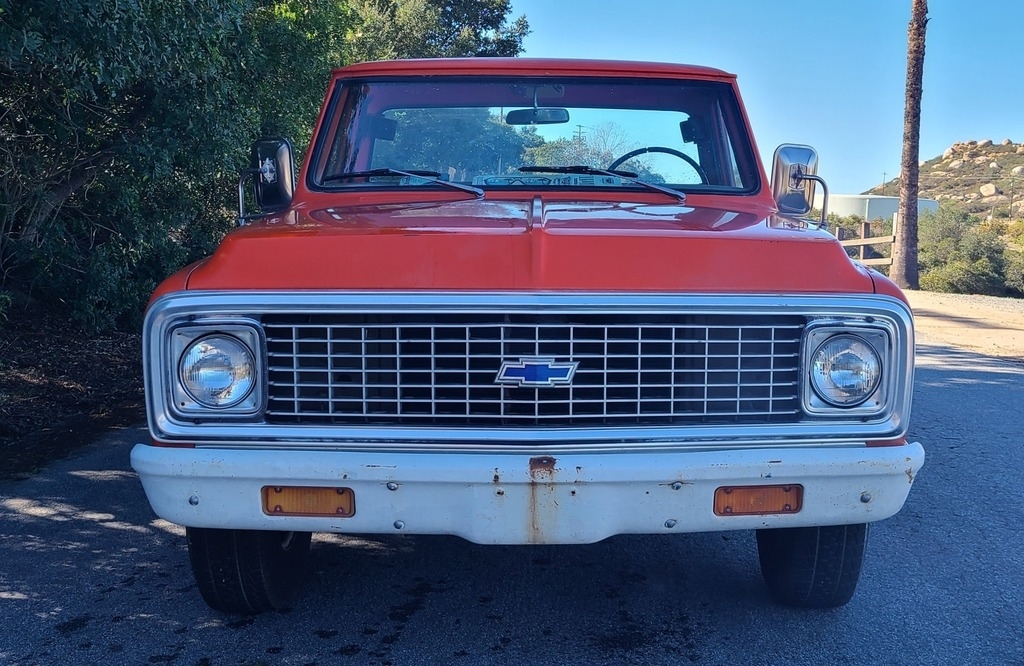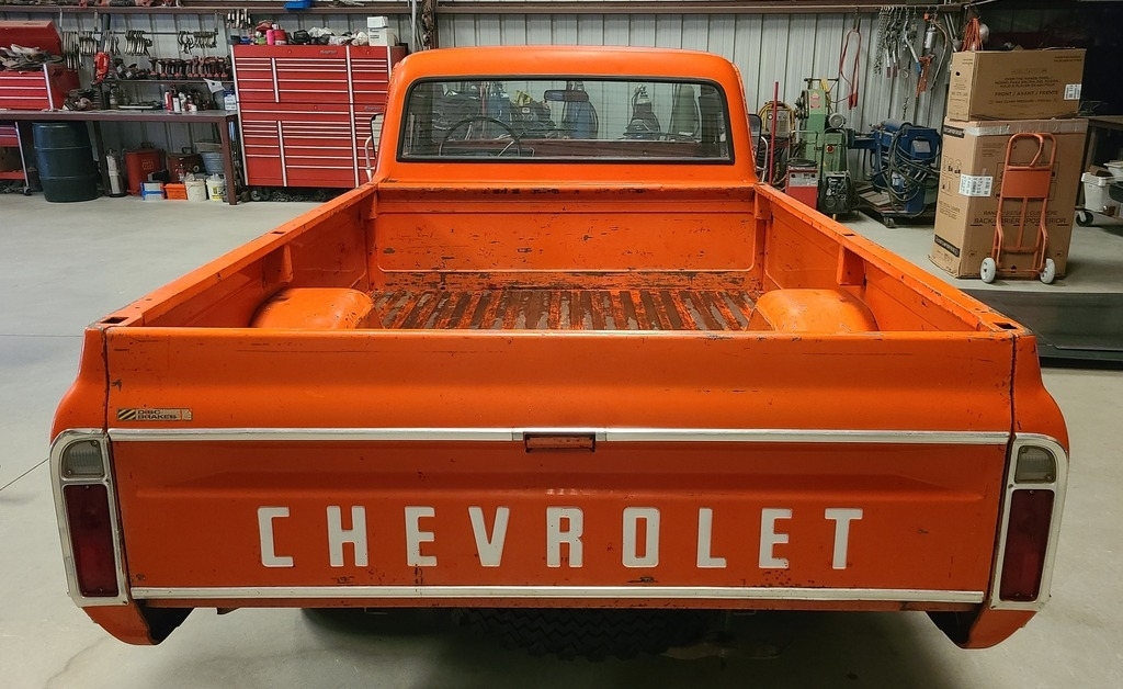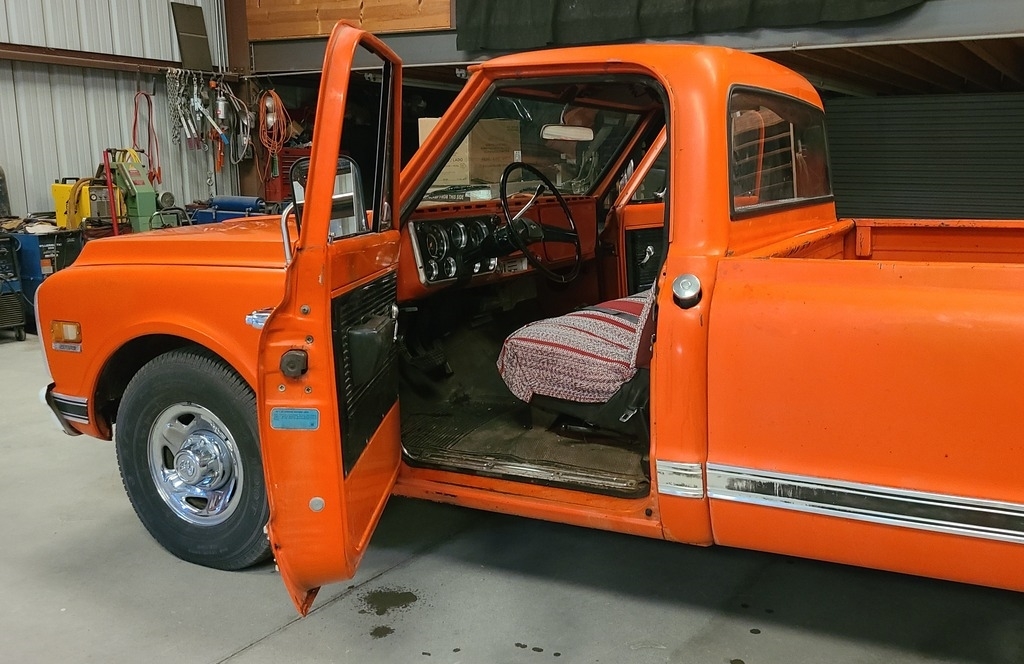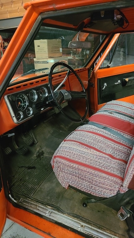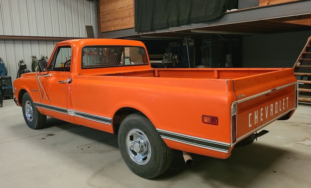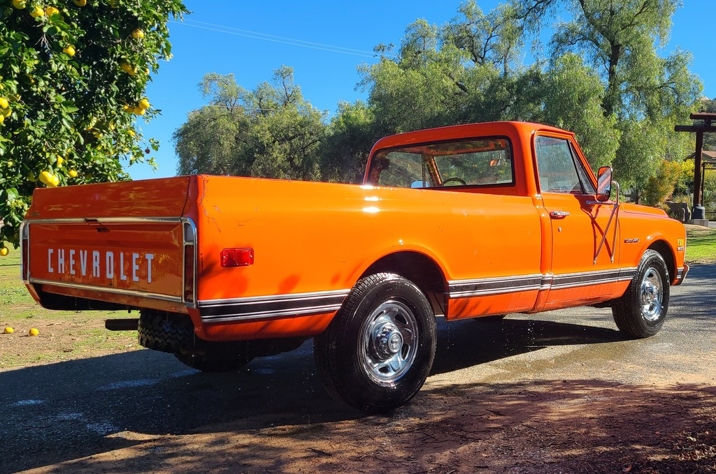 This 1971 Chevy C20 is powered by an 8-cylinder 350 motor and a 3-speed (on the tree) manual transmission with 59,866 miles. Shown with original orange exterior paint and an orange patterned interior.