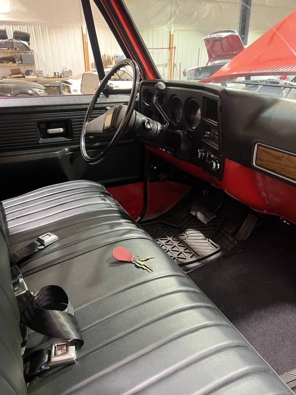 This C10 is powered by a 350 V8 engine paired with a 350TH automatic transmission. The odometer reads 86,000 miles and is shown with a red exterior and a black interior.