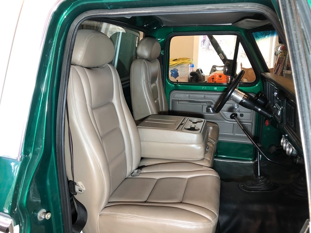 This F-250 is powered by a 400ci V8 engine paired with a 4-speed manual transmission. The odometer reads 123,800 miles and is shown with a two-tone white and green exterior and a tan leather interior. This vehicle has been well-maintained.
