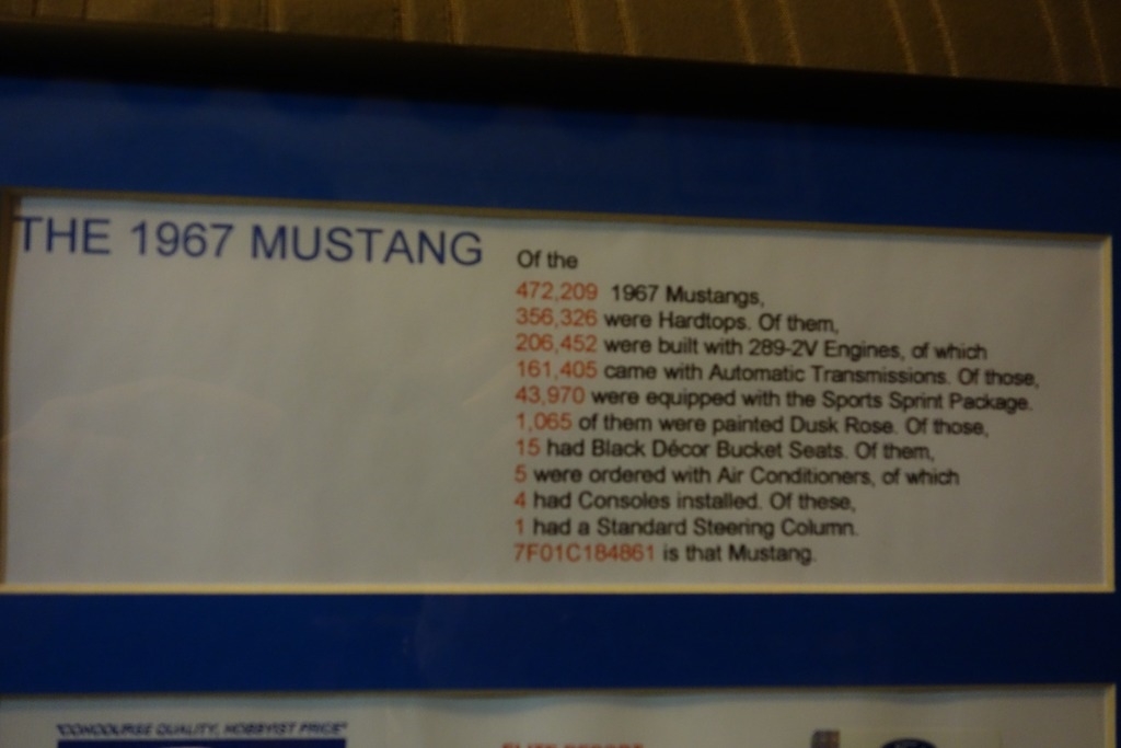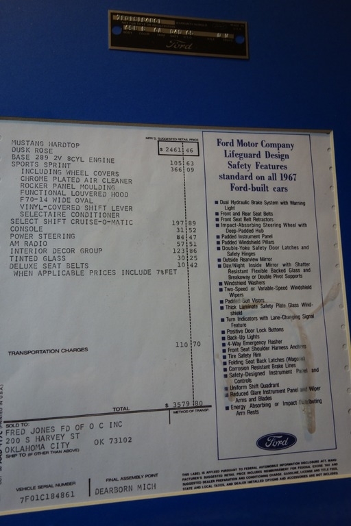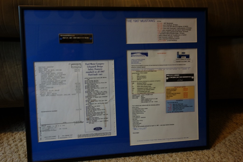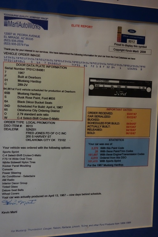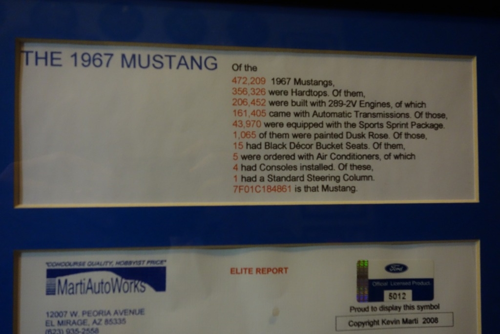 INCLUDED IN THE SALE: The display board for show, Elite “Marty Report,” original paperwork, copies of photos of the vehicle, a meeting with the original owner (if you would like), an extra set of front seat covers, and Mustang advertising from 1967.