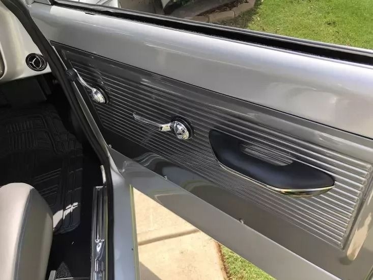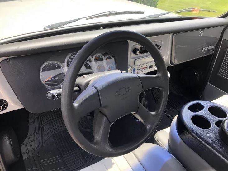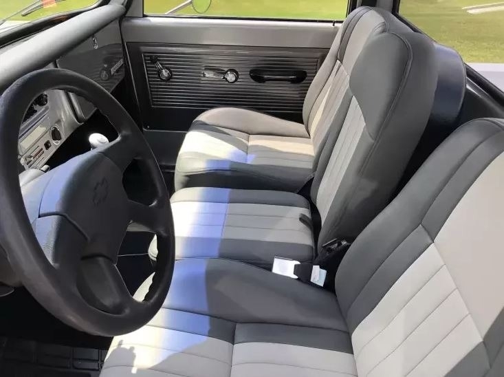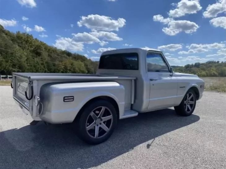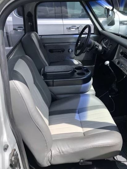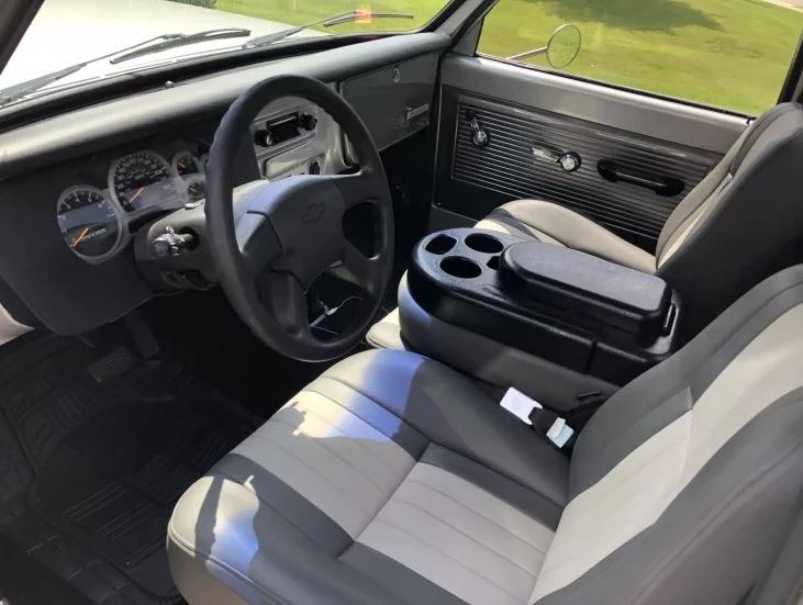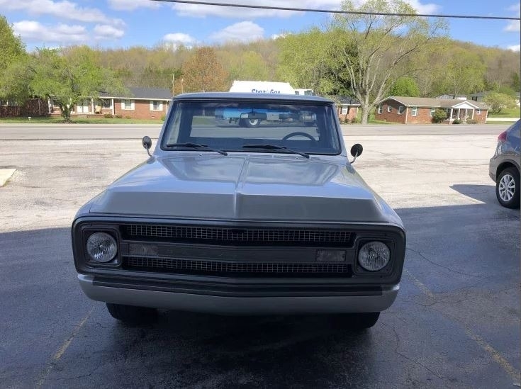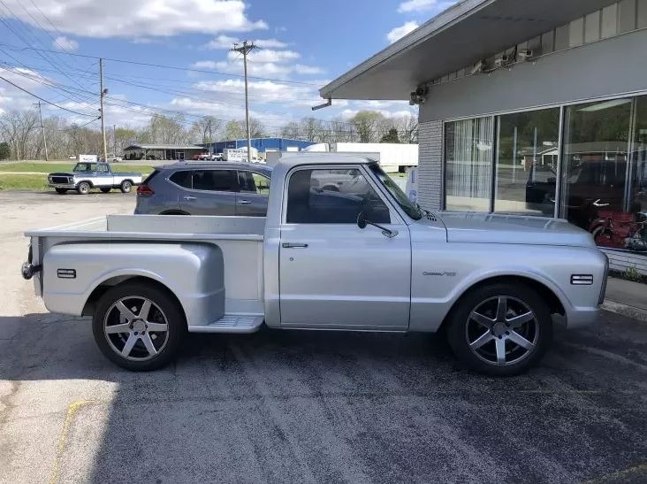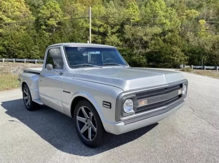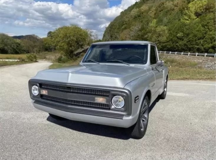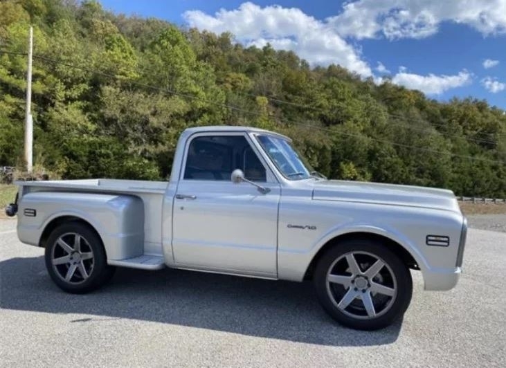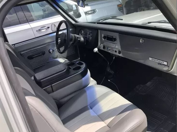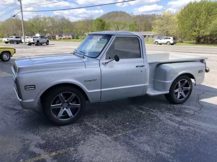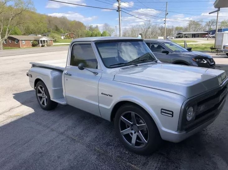 1969 Chevy C10 custom stepside combines the best of both worlds, Classic Look and a Modern Drive Train. It was custom built using a 2004 Chevy Trailblazer donor vehicle including the 4.2I 275 HP fuel injected engine, overdrive transmission, disc brakes, and all the other goodies that comes with it. There was no frame or wiring harness cut during this conversion, and the bodywork is amazing. This truck drives fantastic and is fully RELIABLE. This Chevy C/K 10 Series is shown with a gray exterior and a gray and black leather interior.
