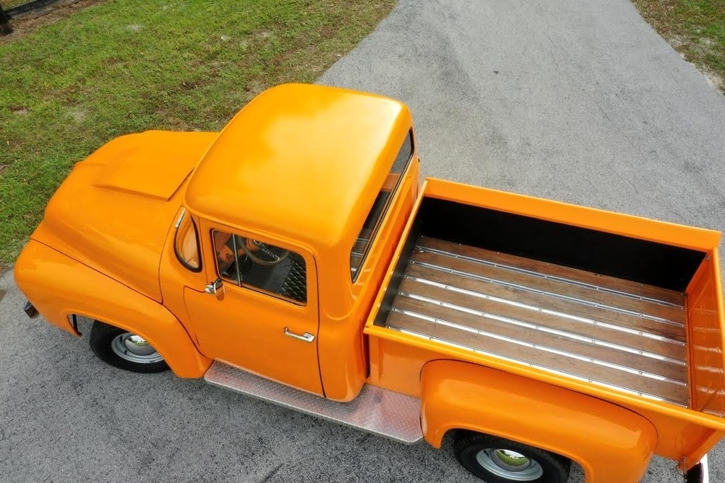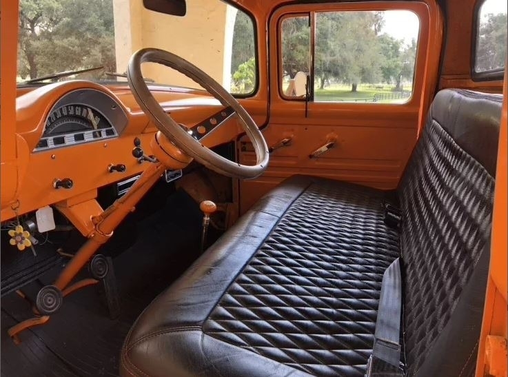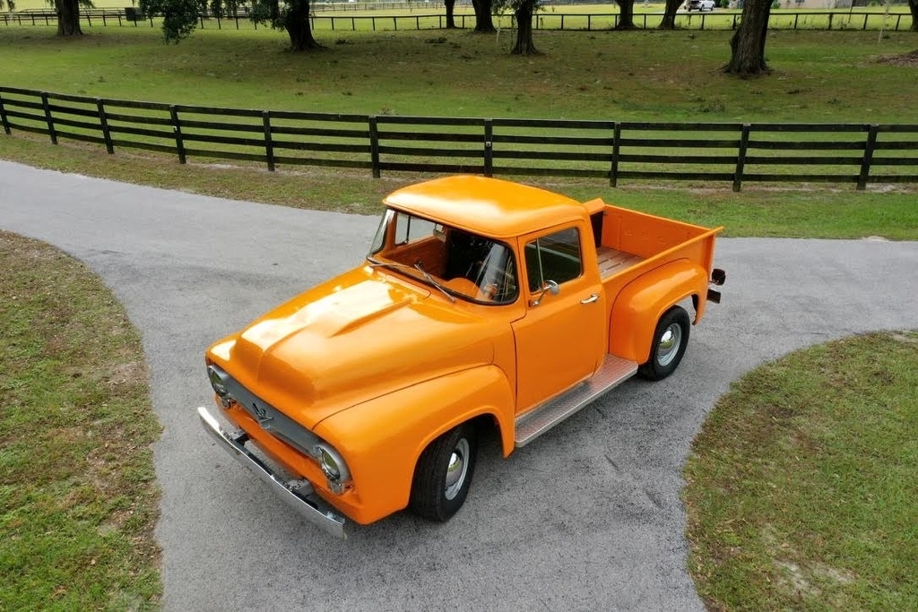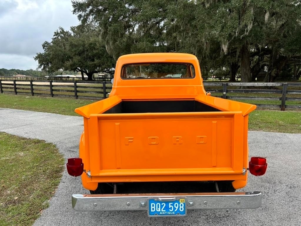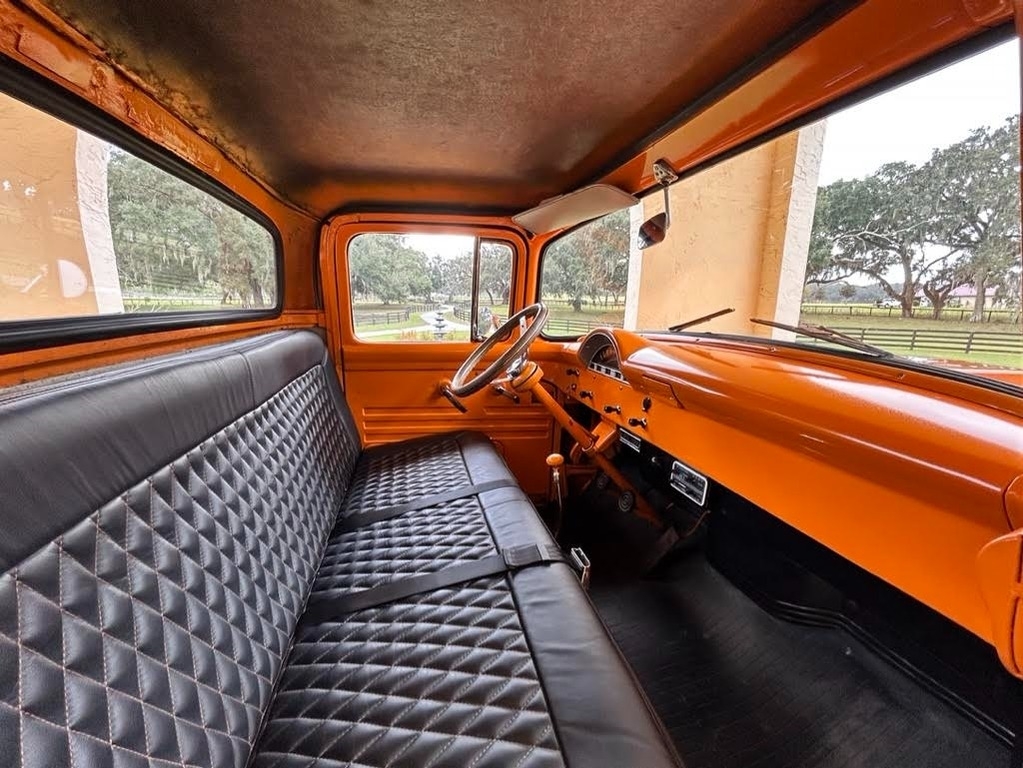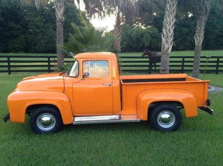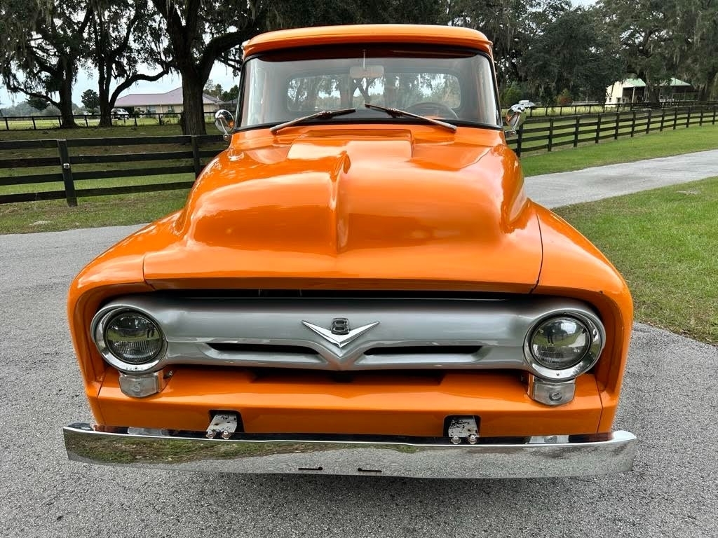 This 1956 Ford F-100 Custom Pickup is powered by the original rebuilt 272 V8 gasoline engine paired with a 3-speed manual transmission. True mileage is unknown the odometer shows 2,158 miles. This Ford F-100 is shown with an orange exterior and a black interior. Fresh annual with oil change, new filters, new battery. Custom black leather bench seat with orange thread to match the catchy orange exterior! Custom shifter knob with daisy design since the truck is named Miss Daisy. This truck drives like a dream.