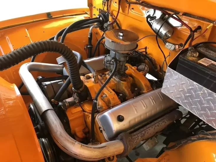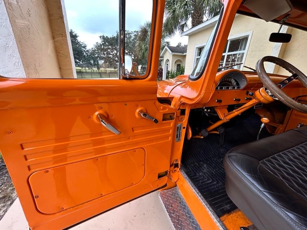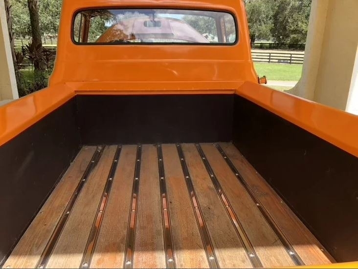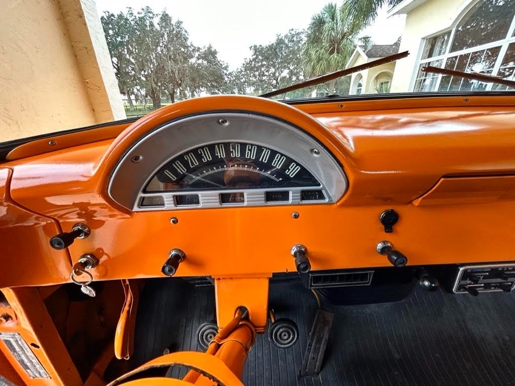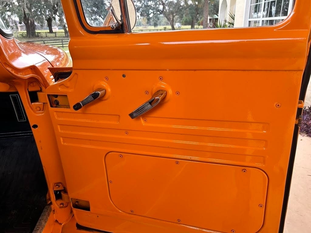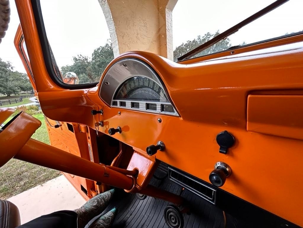 This 1956 Ford F-100 Custom Pickup is powered by the original rebuilt 272 V8 gasoline engine paired with a 3-speed manual transmission. True mileage is unknown the odometer shows 2,158 miles. This Ford F-100 is shown with an orange exterior and a black interior. Fresh annual with oil change, new filters, new battery. Custom black leather bench seat with orange thread to match the catchy orange exterior! Custom shifter knob with daisy design since the truck is named Miss Daisy. This truck drives like a dream.