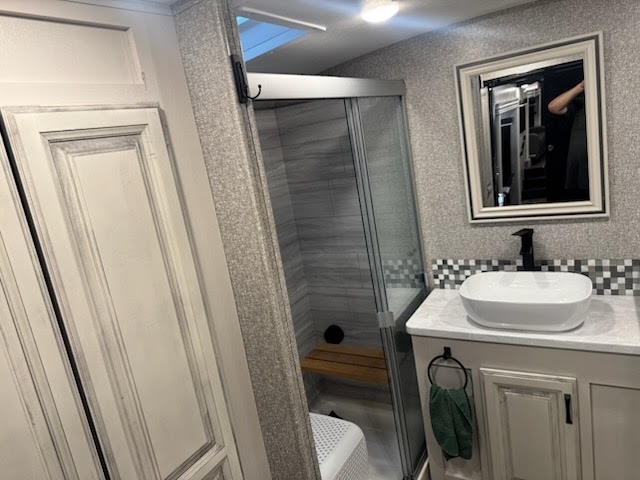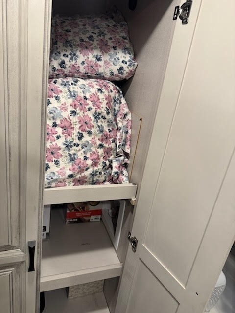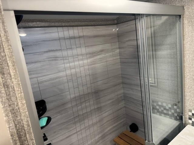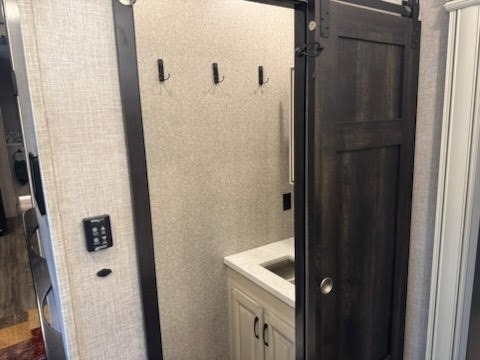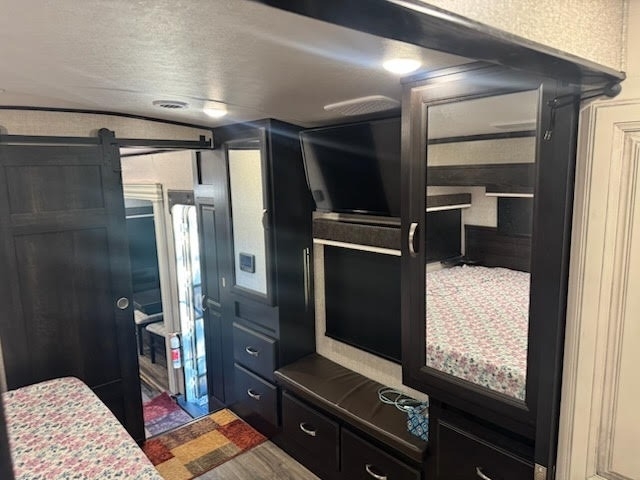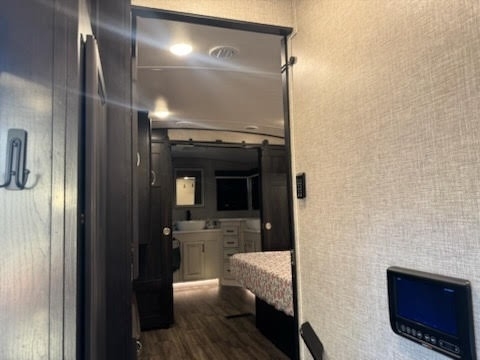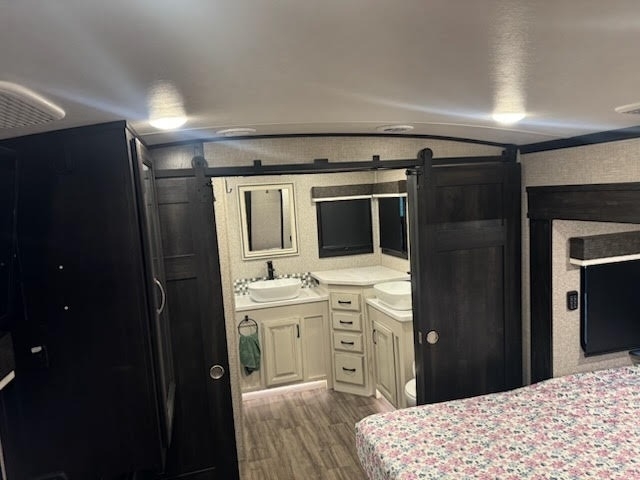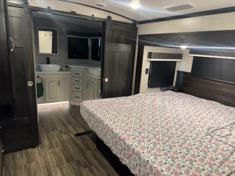 features a king bed, full-sliding door for privacy, and a rear bathroom with a