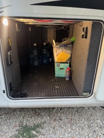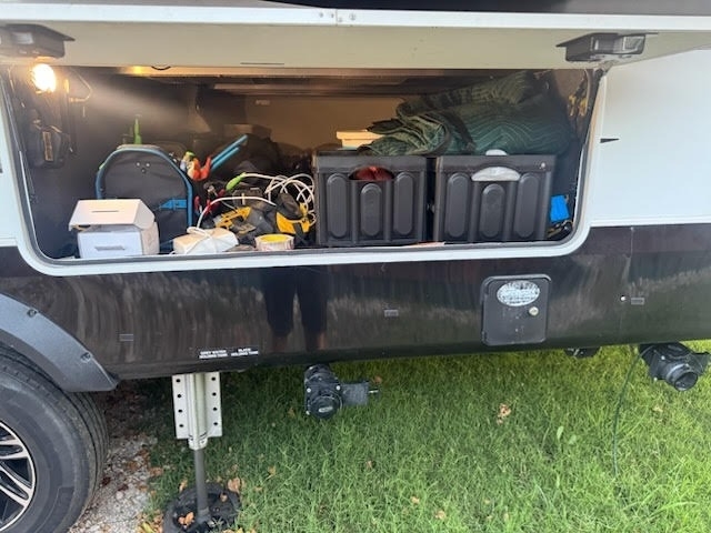 find dual power awnings (28 ft total), 5 solar-charged batteries, 3 propane