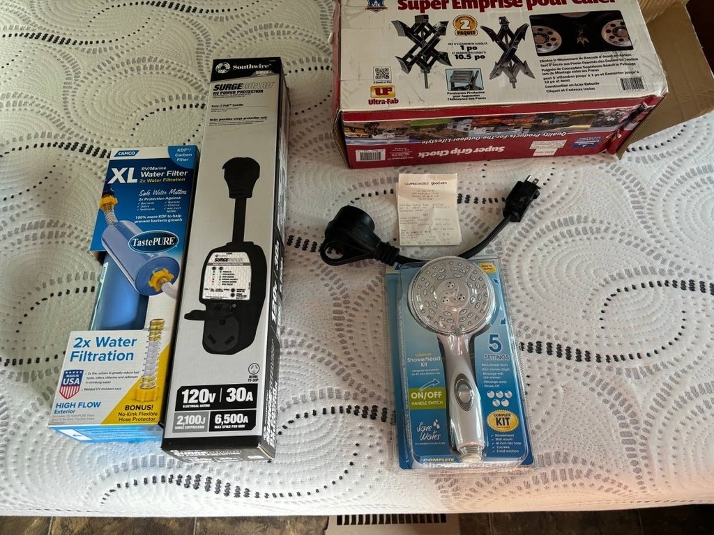 a gas/electric stove and refrigerator, along with a water filter and surge