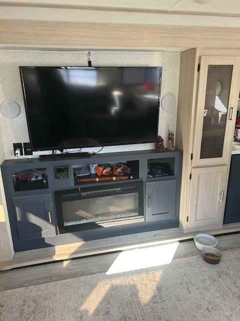 equipped with 2 power-retractable slide-outs, 2 power awnings, 1 A/C unit, a fireplace,