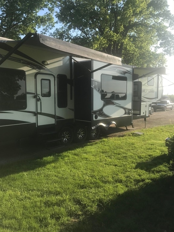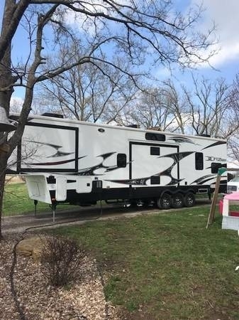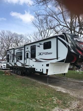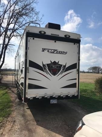 This 2013 Keystone Fuzion 375 Travel Trailer has an overall length of 40 feet and  comes equipped with a 10 ft garage, 3 Slide Outs, 2 Awnings, 2 A/C Units and has  plenty of room to sleep 8. This is a non-pet/non-smoking RV, there has not  been any accidents or water damage and has been stored indoors during the winter.