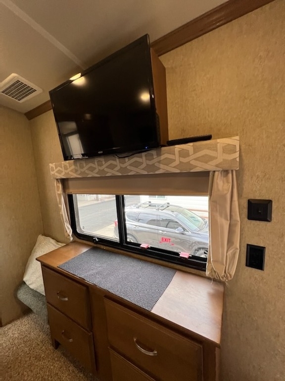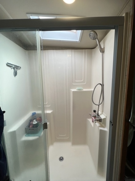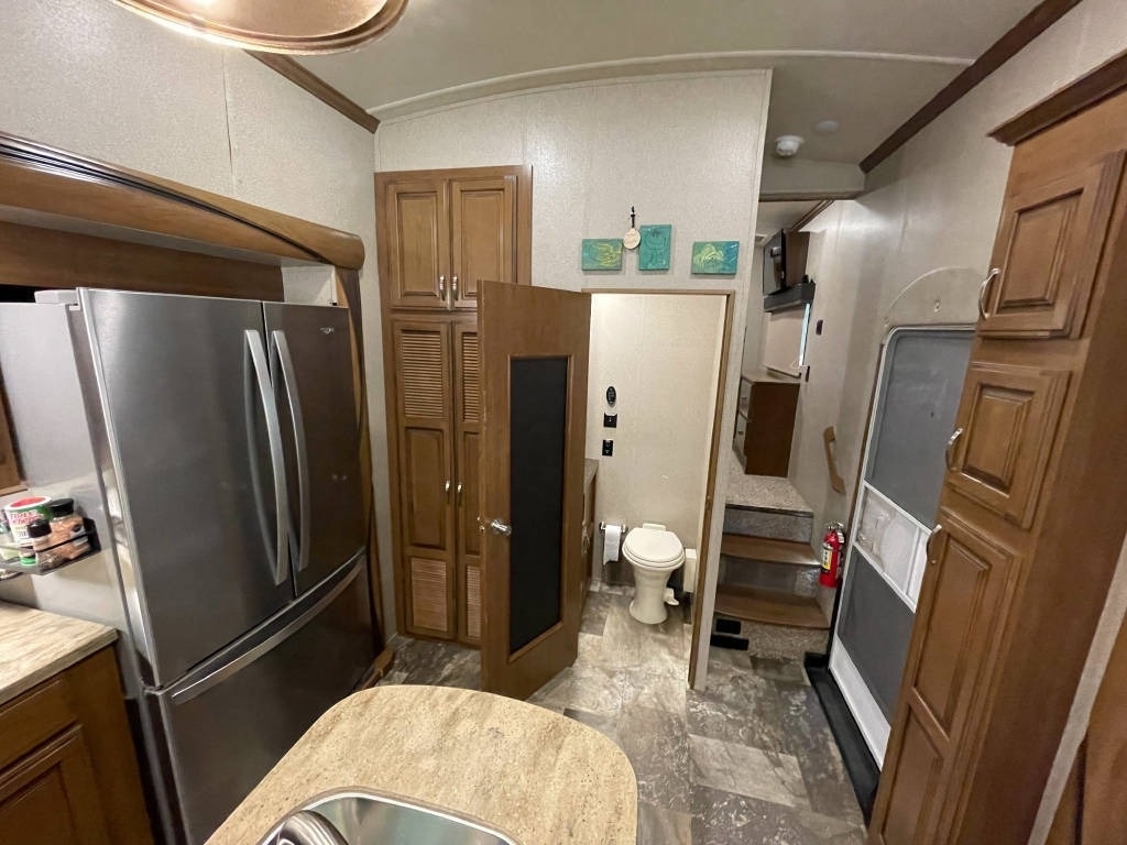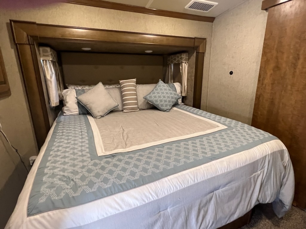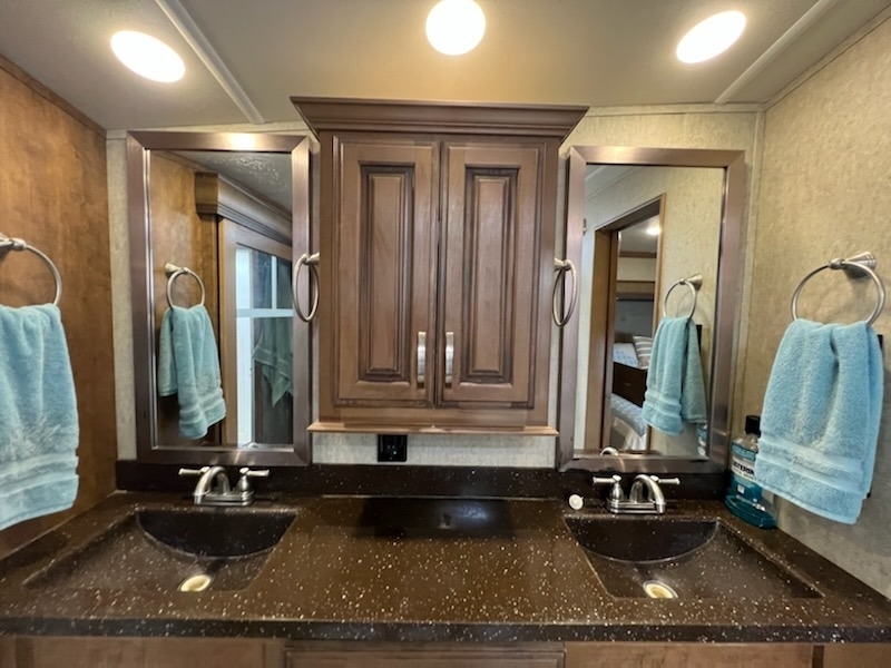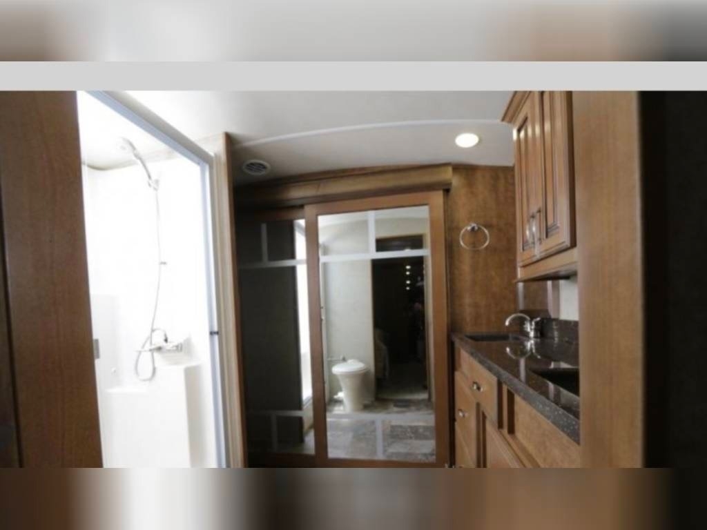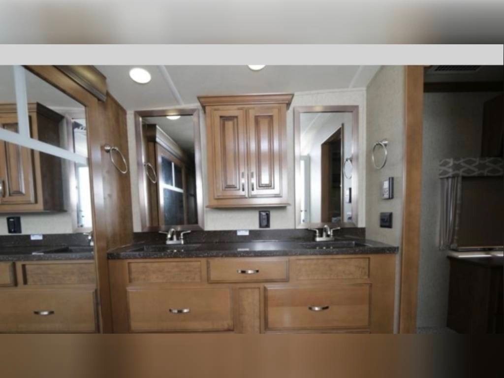 Dual A/C units, 6 point hydraulic leveling, whirlpool residential size stainless steel refrigerator and microwave. High ceilings, one full and one half bath. New faucets, new toilet, slide out seals installed in 2022. New roof in 2020.