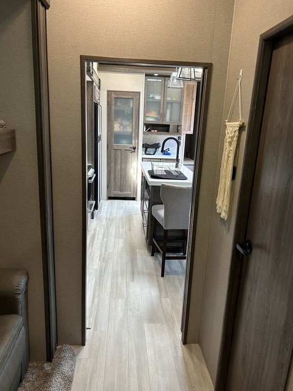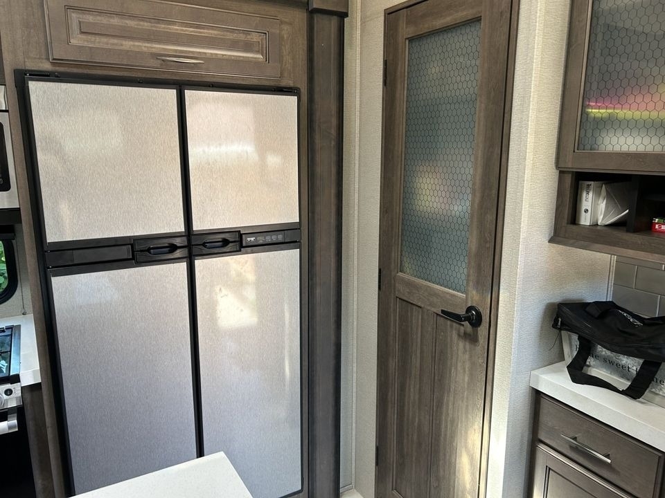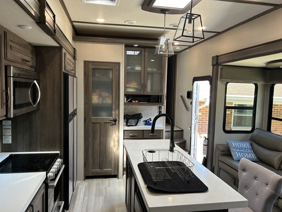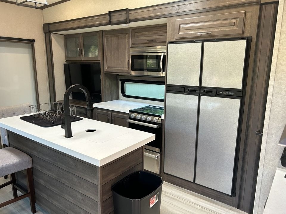 kitchen with fridge, sink, storage, gas griddle, dual power awnings &