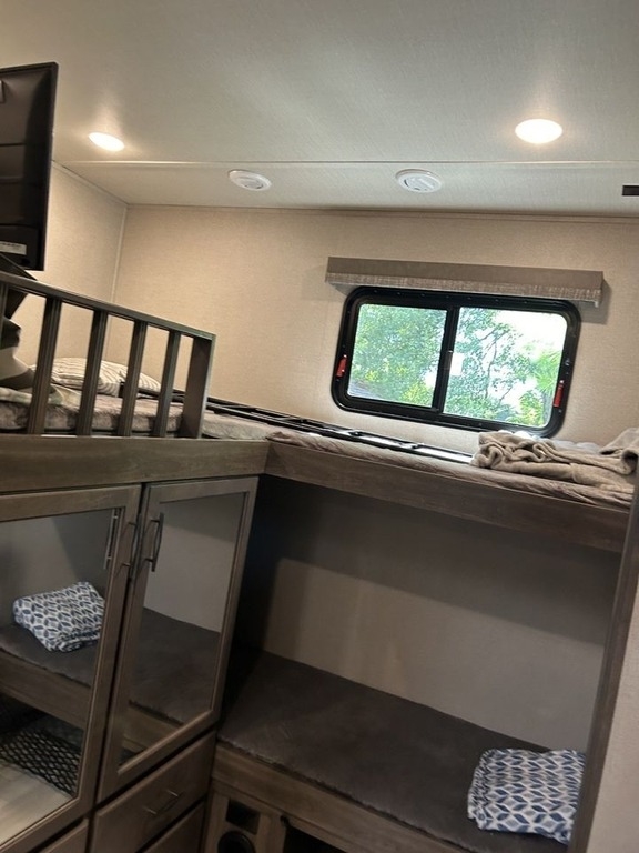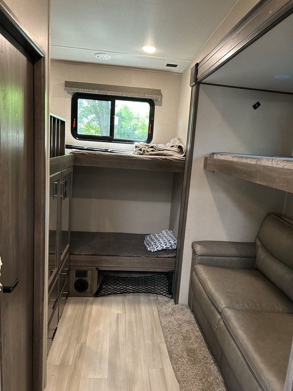 Private guest room in the rear includes 3 bunks & a trifold sofa, storage