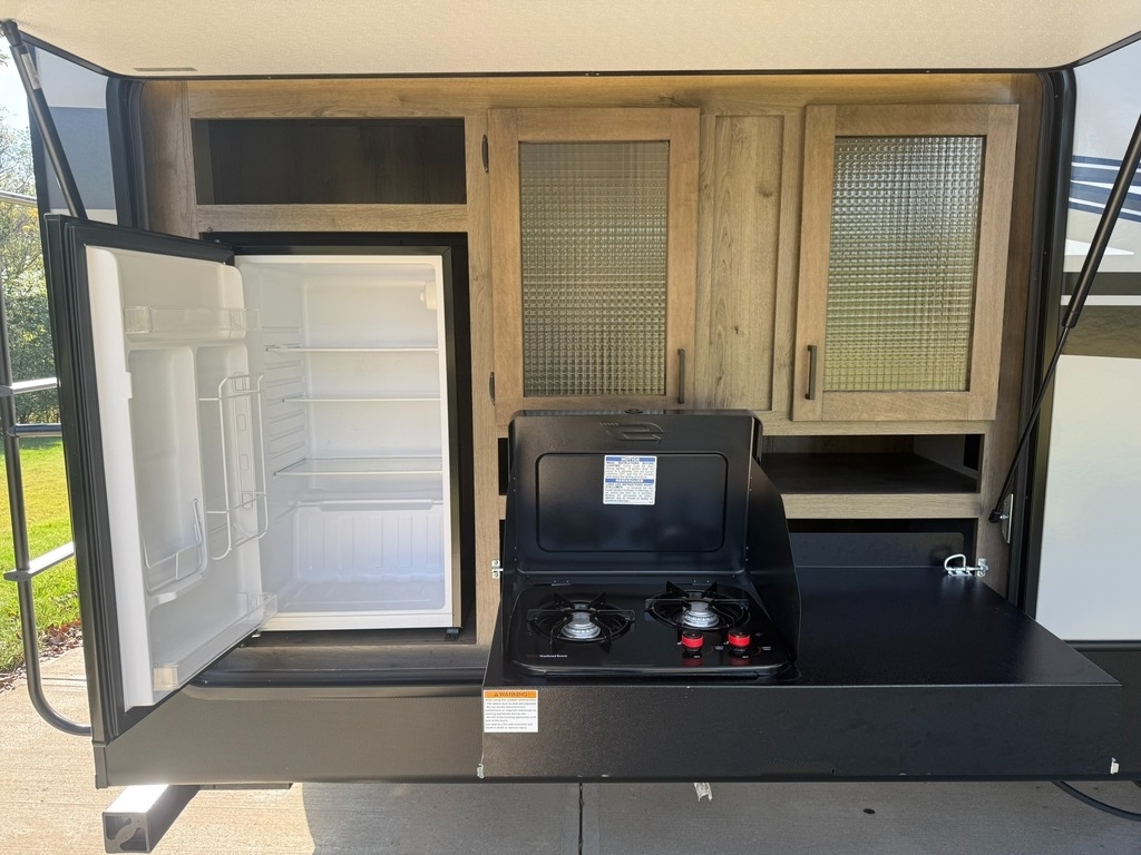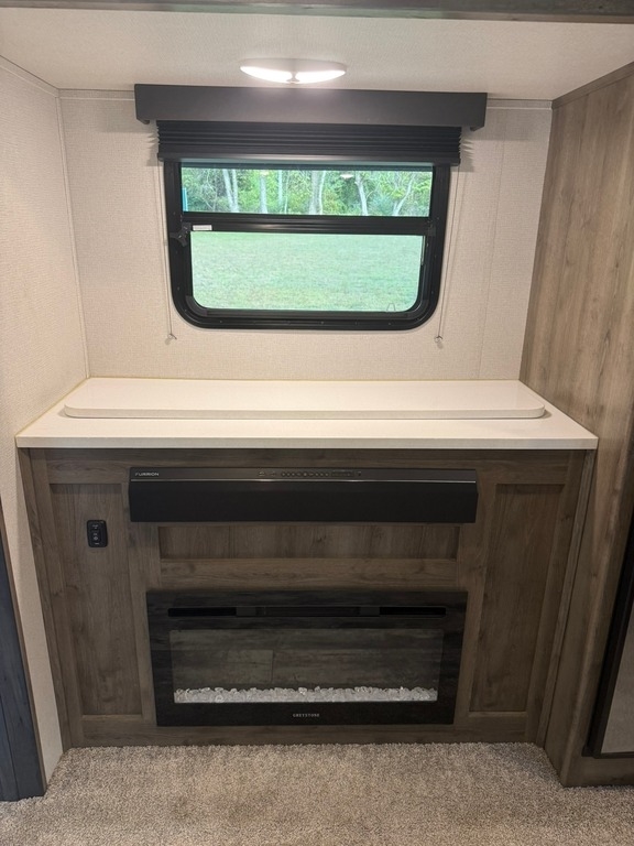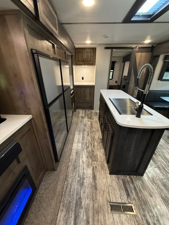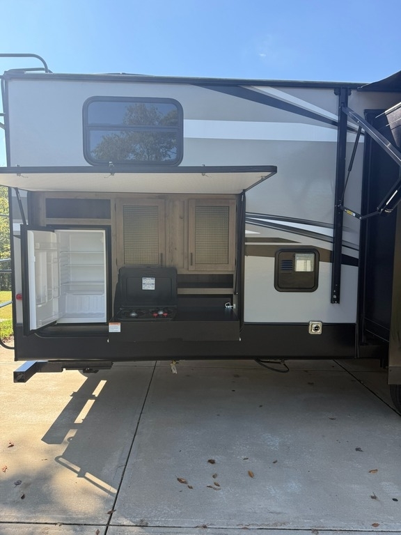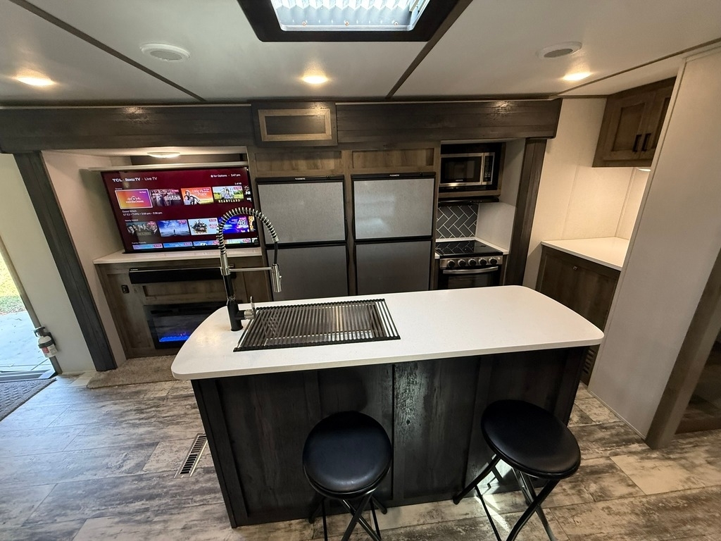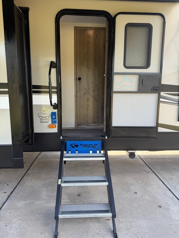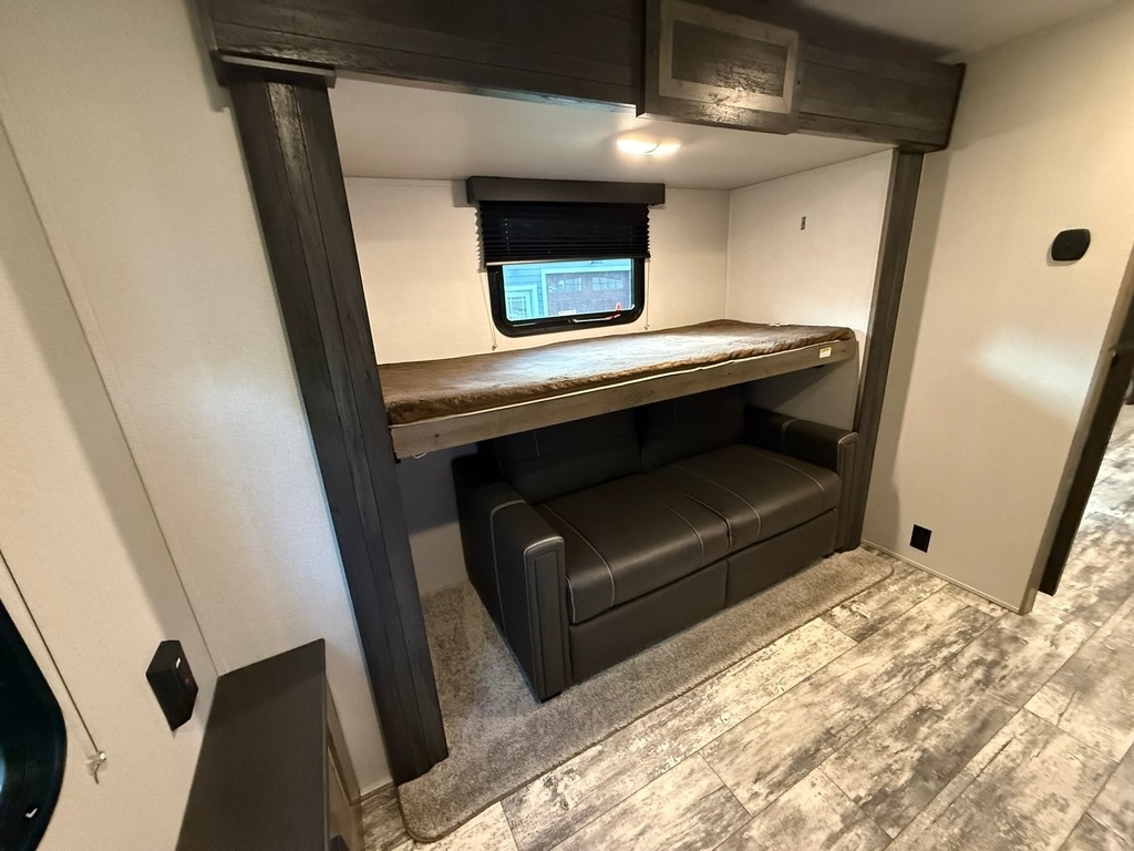 This Keystone has an overall length of 38.67 feet and comes equipped with 3 power retractable slide-outs, 1 power awning, 2 A/C units, a bunkhouse, a fireplace, an outdoor kitchen, and plenty of room to sleep 8. This unit has been well-maintained.