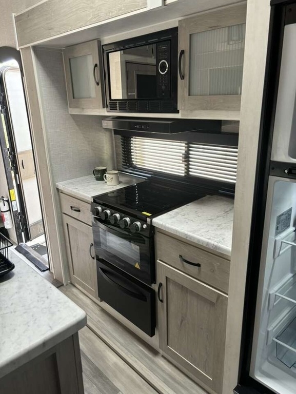 The kitchen is well-equipped with an oven/stove, microwave oven, full-size refrigerator, and ample storage space. The kitchen / living area features a comfortable seating configuration with chairs and a carpet/vinyl flooring type.