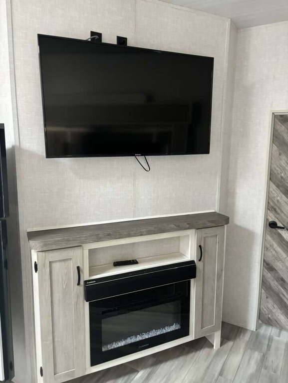 Entertainment is covered with television, speakers, and pre-wiring options for cable and satellite. The interior features an earthtones color scheme, wallpaper, and wood finish, creating a welcoming atmosphere.