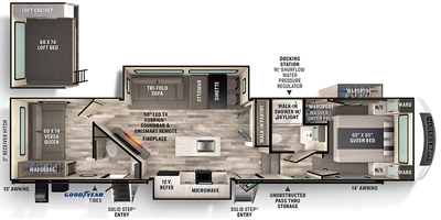 Safety is a top priority in this RV, with smoke detectors, carbon monoxide detectors, a propane alarm, and emergency exits included for your peace of mind. Multiple slide-outs and awnings expand the living space and provide outdoor comfort.