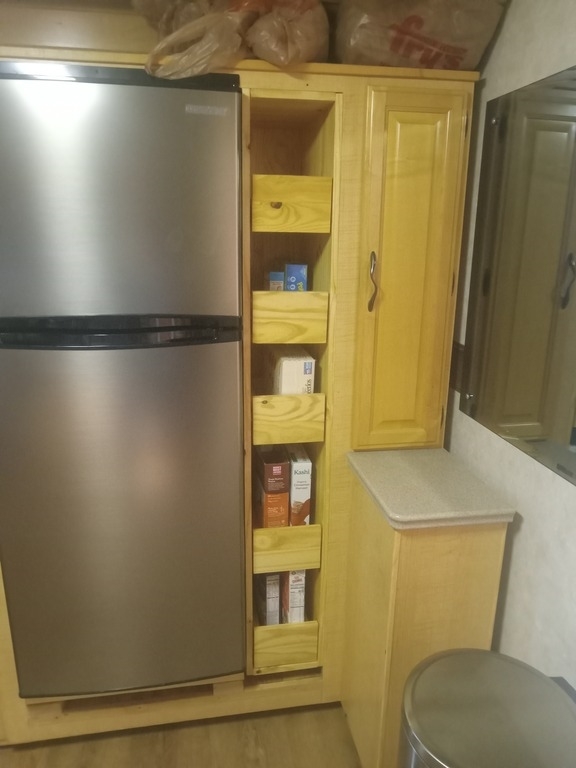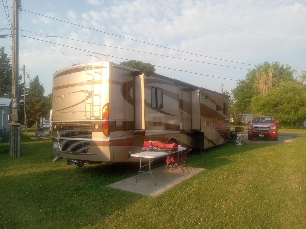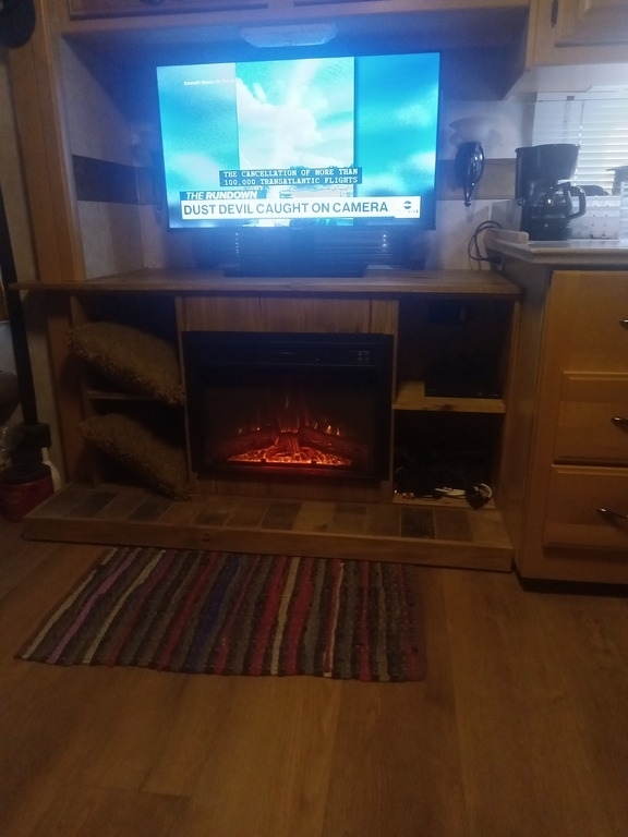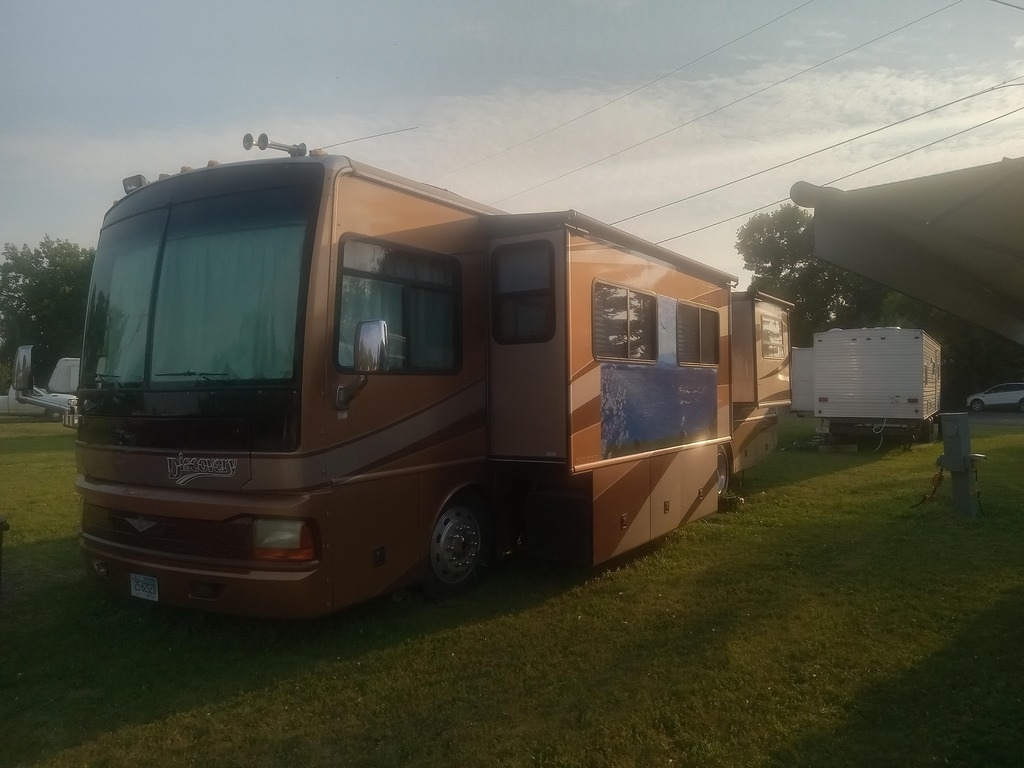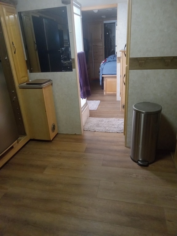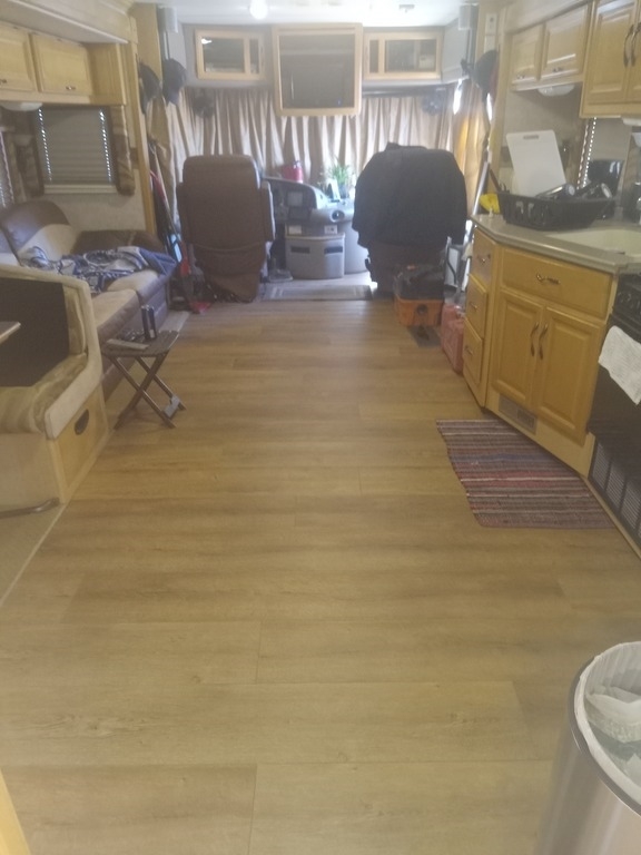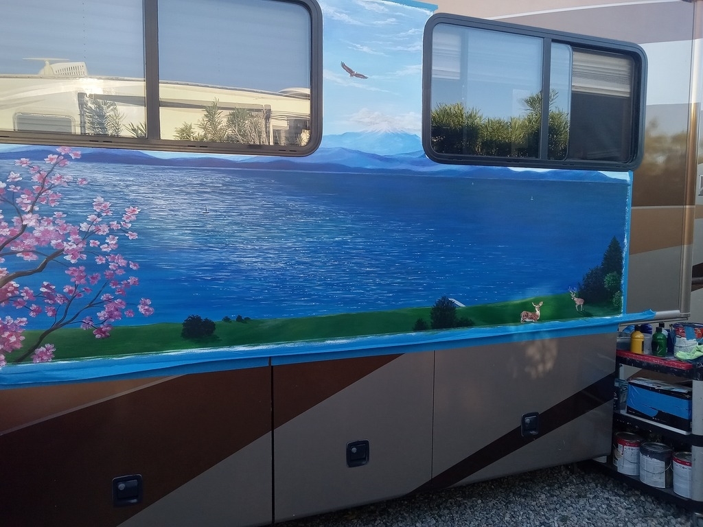 “The driver's side slide-out features a hand-painted mural, and new vinyl plank flooring has been installed throughout. The RV also includes a custom-built entertainment center and a new 12-volt fridge. A new fuel pump was installed in May, and the oil and filter have been changed annually, along with regular fuel filter replacements. This well-maintained and comfortable RV can sleep up to six people.”
