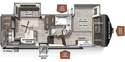 This Rockwood has an overall length of 28.9 feet and comes equipped with 2 power retractable slide-outs, 1 power retractable awning, and plenty of room to sleep 4. This unit has been well-maintained.