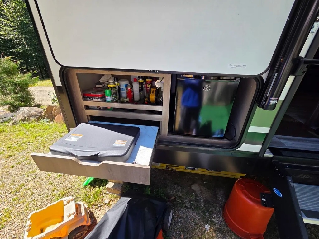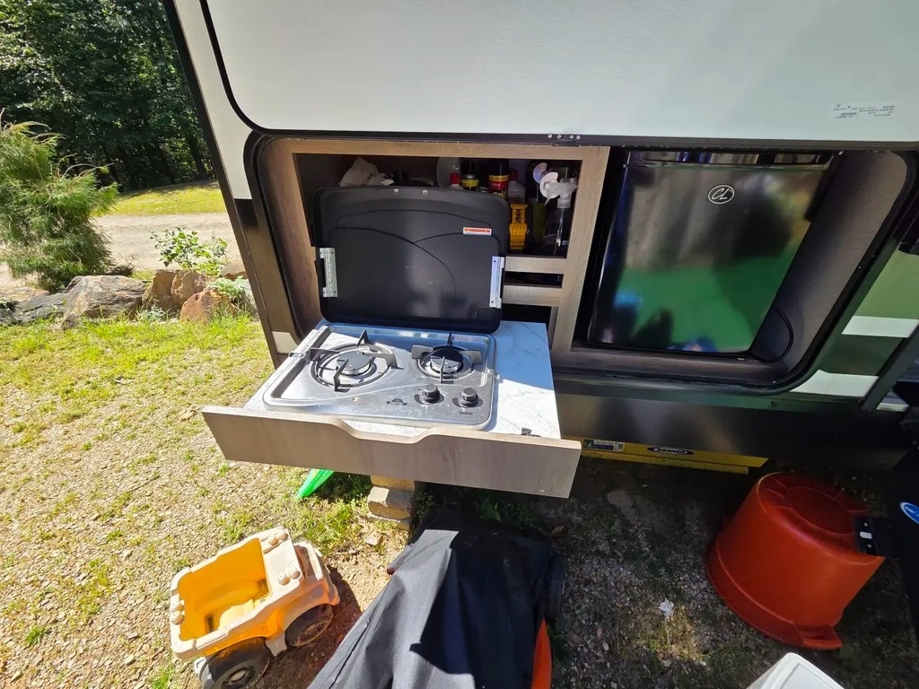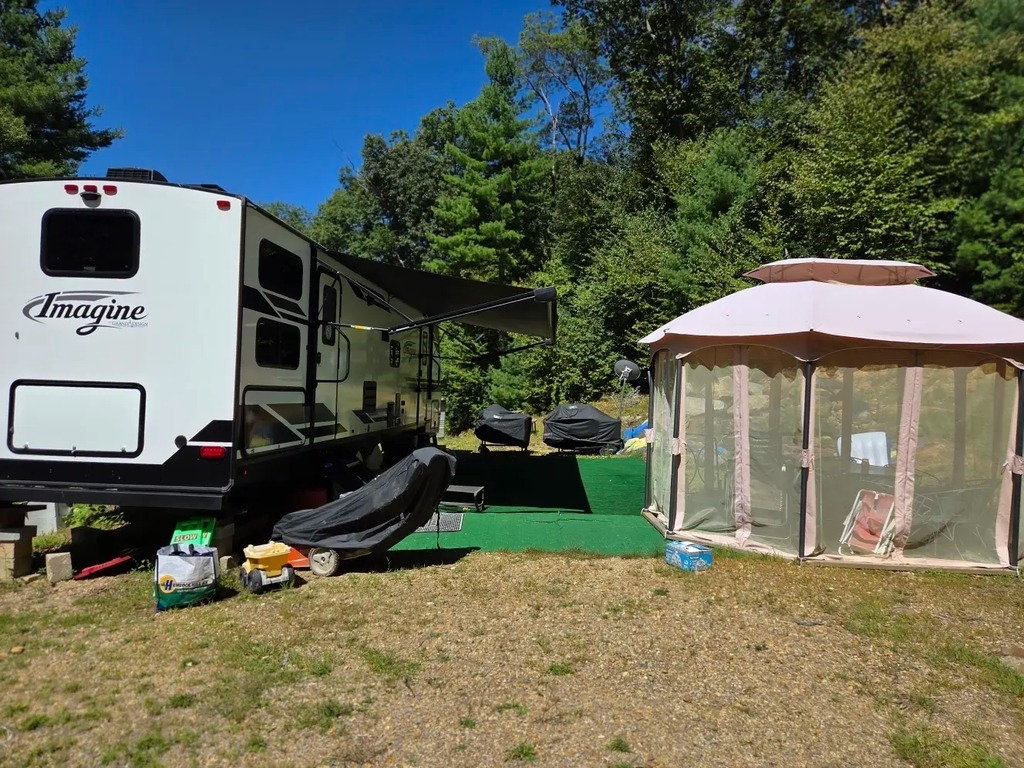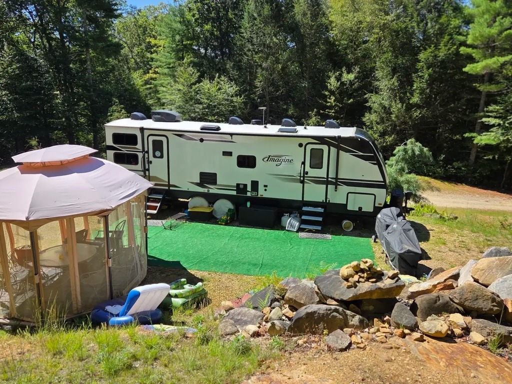 “For sale is my 2021 Grand Design Imagine 2910BH Travel Trailer, 34 feet long, in excellent, lightly used condition — slept in only a handful of times. Still has one year left on the factory warranty. This camper is fully loaded and everything works perfectly. Features include dual bunks, a large private master suite with its own entrance, a spacious shower (I’m 6'0”, 275 lbs and fit comfortably), heated and massage recliners, a power slide-out, an outdoor kitchen, and a power awning. The trailer also includes a tow package with sway bars, extra custom fresh water storage tank, tents, outdoor carpet, two grills, air compressor, and floats — truly a turn-key setup ready for your next adventure. It also comes with a built-in phone app for easy parking and leveling, and I recently upgraded the hot water tank. The camper has been professionally winterized and covered every season (includes a $1,000 custom cover). The unit has already been professionally winterized for the year. A 6-ft tall, 10x20 dog kennel is also included — just needs to be installed. Currently located on a huge private lot at Willington Lake Resort — an awesome place with great community events and amenities. So pack your bags and prepare for unforgettable experiences. This one is ready to roll — just bring your gear and go!”