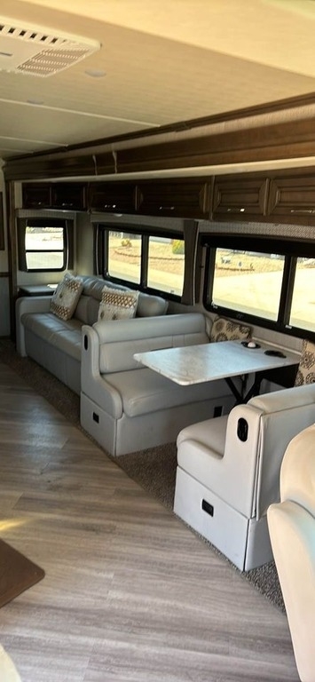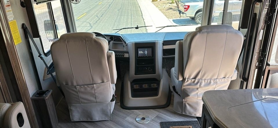 for comfort, this RV comes equipped with a cozy electric fireplace, reclining