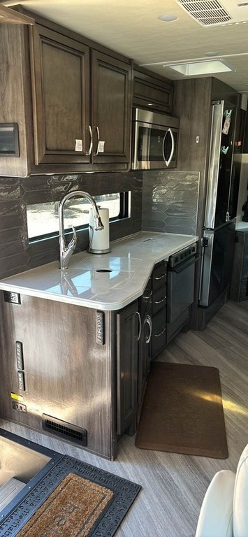 electric/propane refrigerator, three-burner oven, microwave, and ample storage,