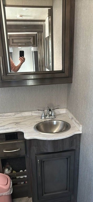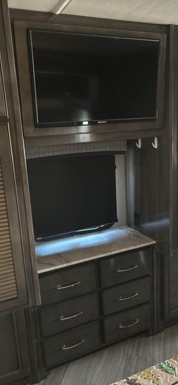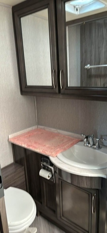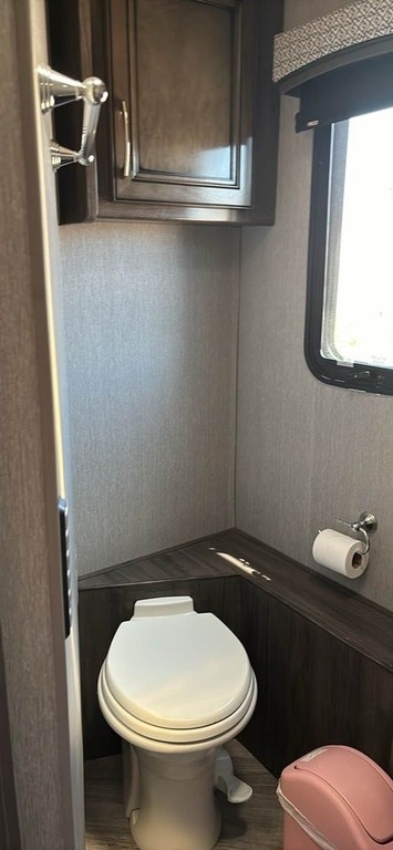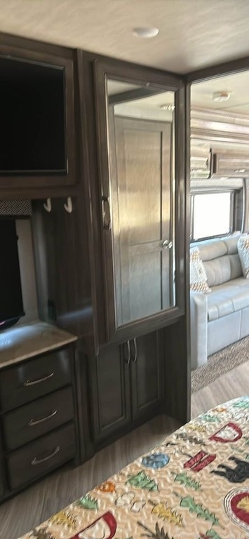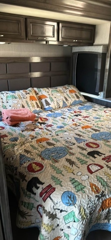 bedroom located at the center of the RV. The master suite boasts a king-size