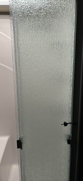 fixtures including a porcelain toilet and a shower with a plastic/glass door,