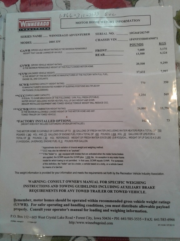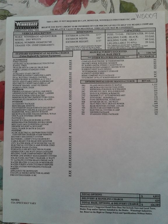This 2005 Winnebago is powered by a 310HP 6.8L Triton V10 Gas Engine, Paired with a 4-speed Automatic Transmission, and Driven on a Ford Chassis, with 52,944 Miles. The overall length is 33.7 feet and comes equipped with an Onan 5500 Generator, 2 Slide Outs, 1 Awning, 2 A/C units and plenty of room to sleep 6. It is proceeded by a