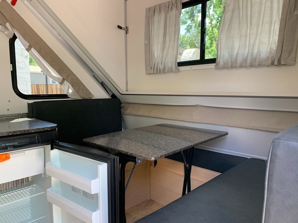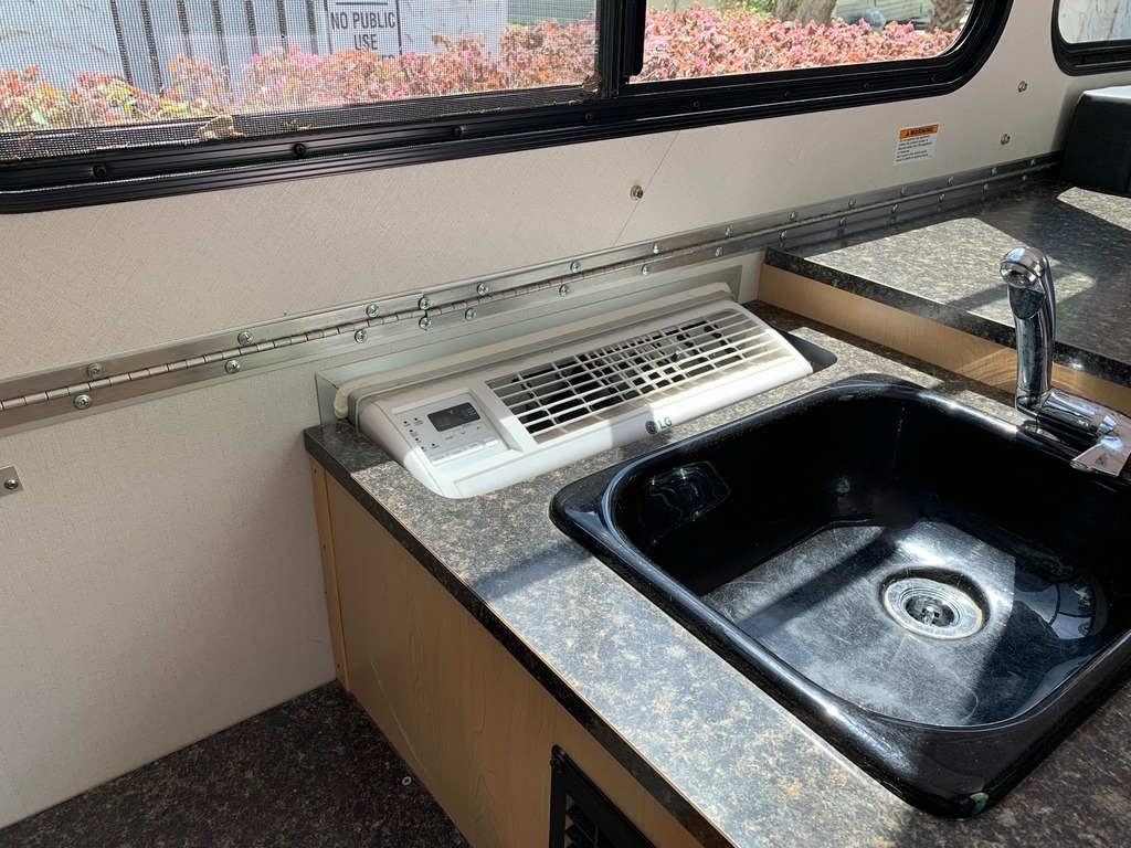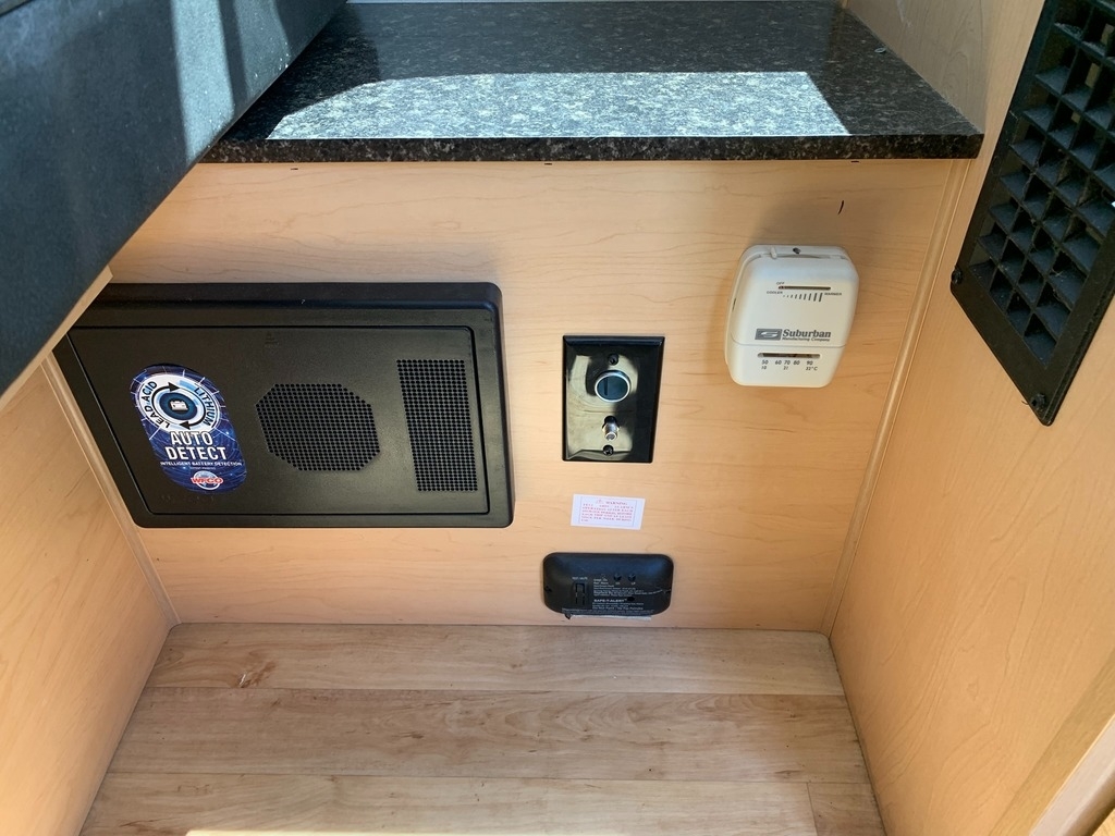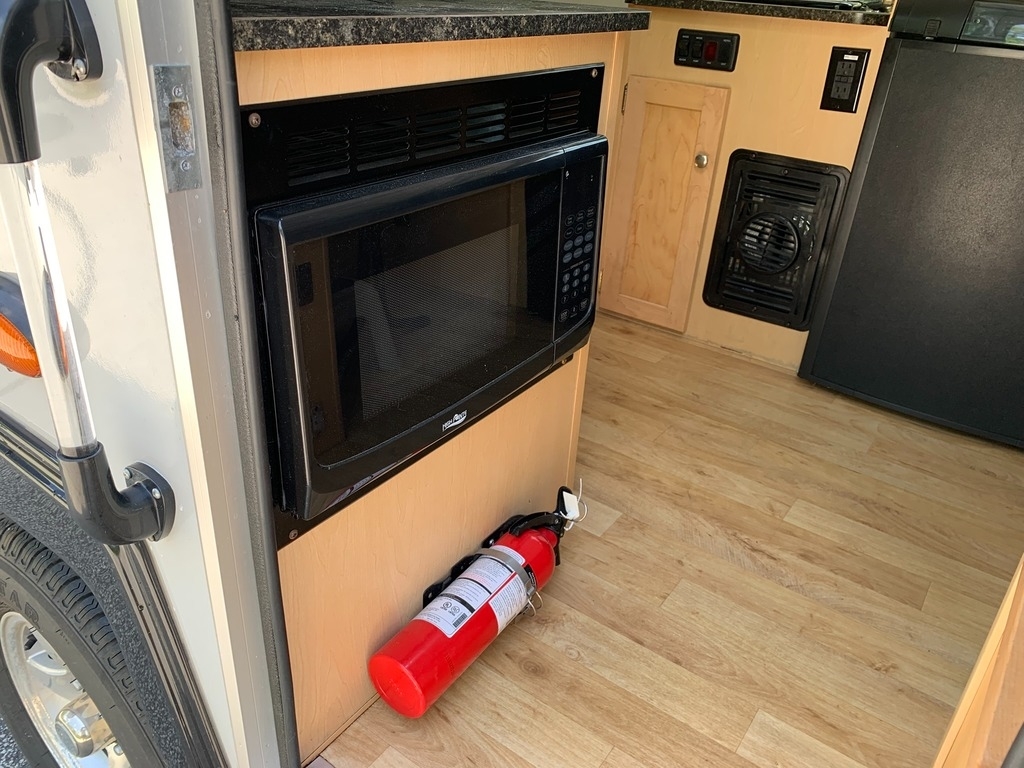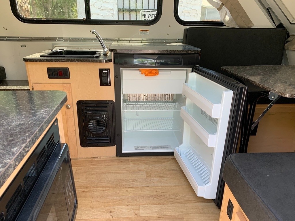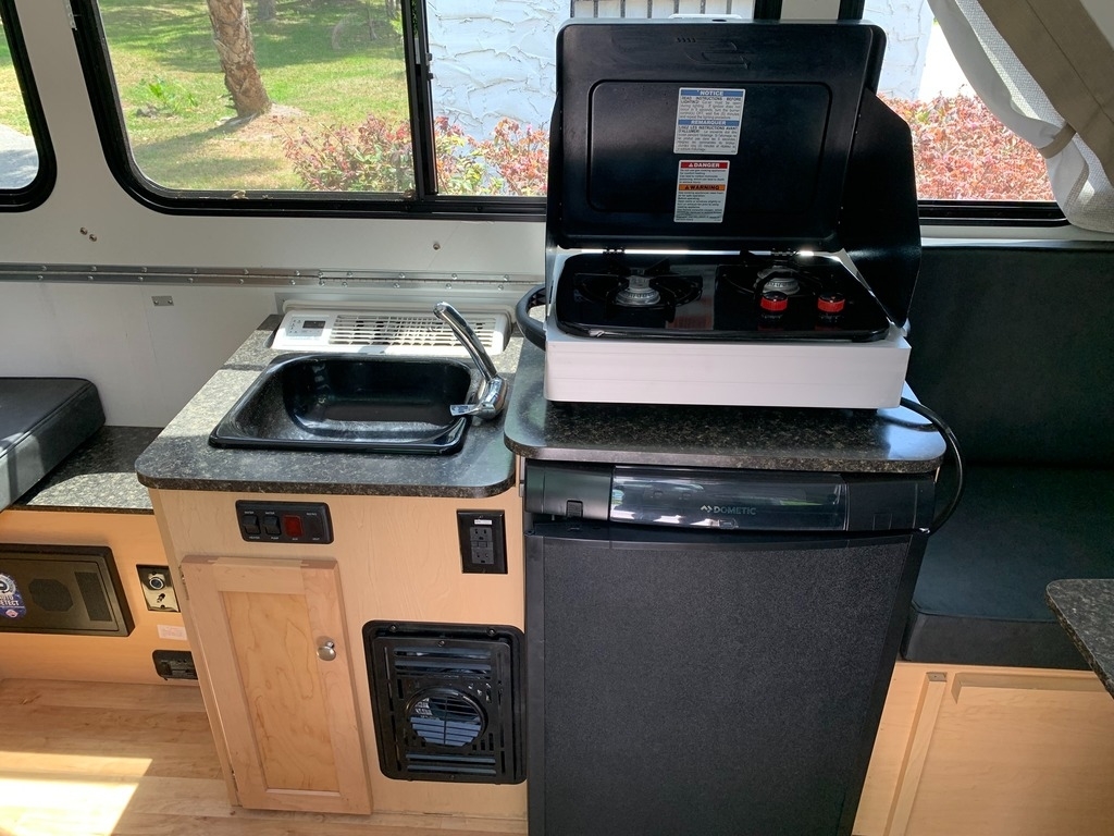 tank, a 3-way refrigerator, a 2-burner stove, and a microwave. It also has a