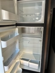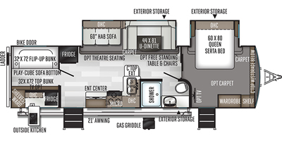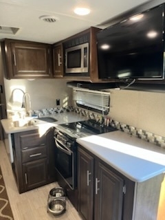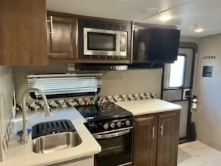 The fully equipped kitchen features solid-surface countertops, a 3-burner range with oven, microwave, and mid-size electric/propane refrigerator. There’s ample cabinet storage, an overhead vent fan, and a stainless sink with cutting board covers. For those who love to cook outside, enjoy the outdoor kitchen with sink and additional prep space under the awning.