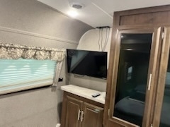 The Rockwood Ultra Lite offers a warm, inviting interior finished in light wood tones and durable vinyl flooring throughout. The center living area includes a leather sleeper sofa and a comfortable dinette that converts for extra sleeping space. An entertainment center with a large flat-screen TV creates the perfect spot to relax after a day of adventure.
