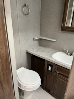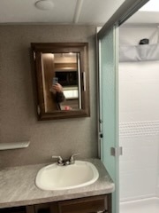 At the front of the trailer, the private master suite features a queen bed with a full sliding privacy door, mirrored wardrobe closets, and under-bed storage. The rear bathroom includes a large glass-enclosed shower, a toilet, vanity with medicine cabinet, and generous storage.
