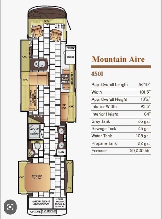 This 2015 Newmar Mountain Aire M-4501 is powered by a 500 hp Cummins Diesel Engine, Paired with a Allison Automatic transmission, and only has 42,000 Miles. With an overall length of 45' feet coupled with 4 Slides, 5 Awnings and sleeps 6. This is a non-pet/non-smoking RV and there has not been any accidents or water damage.