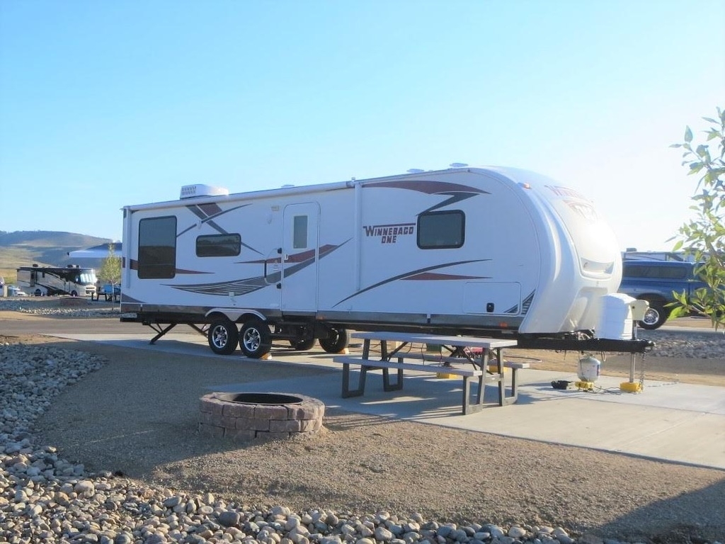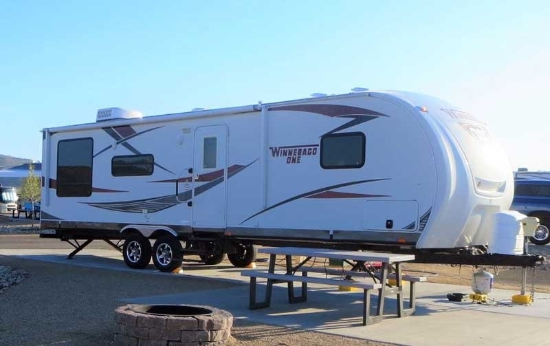 This Winnebago has an overall length of 34.5 ft and comes equipped with two slide outs, a power awning, and room to sleep four.