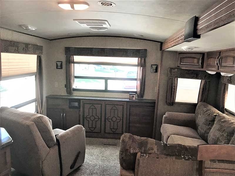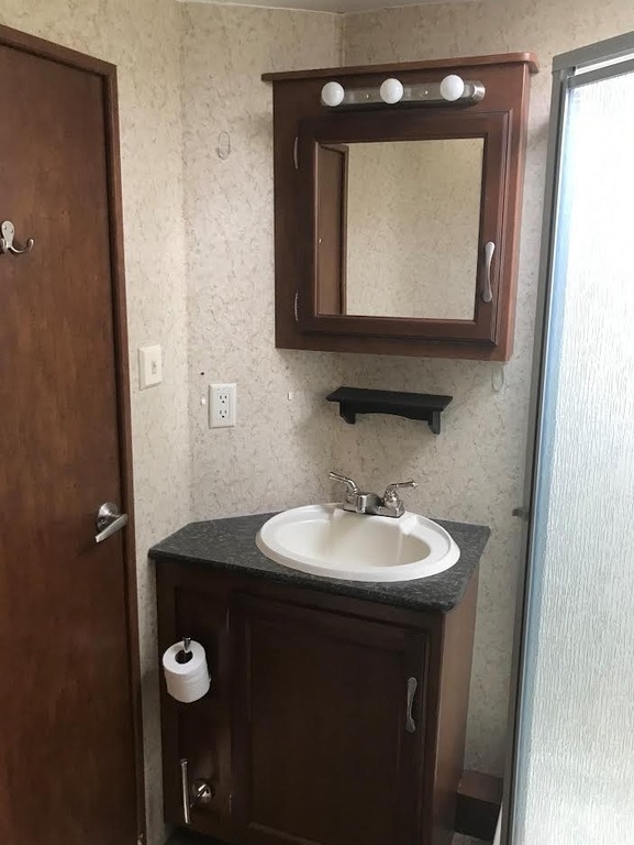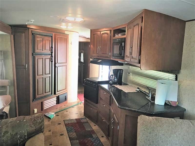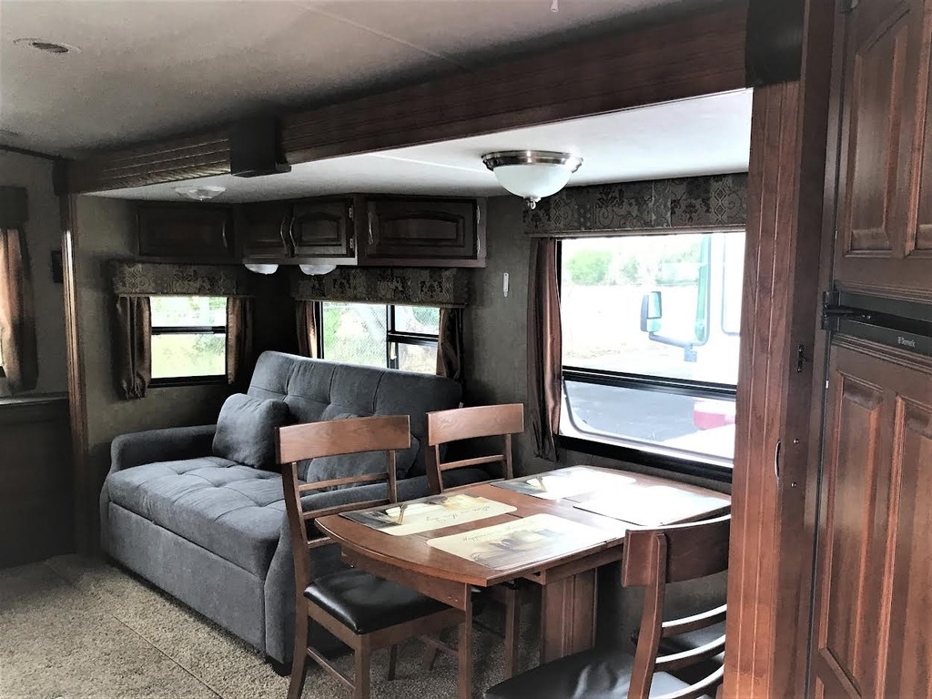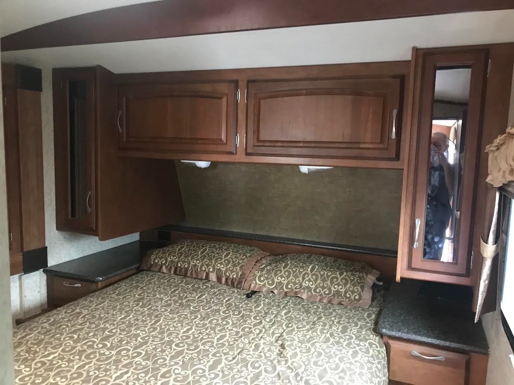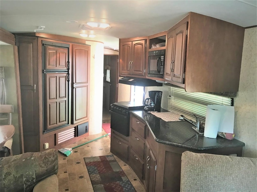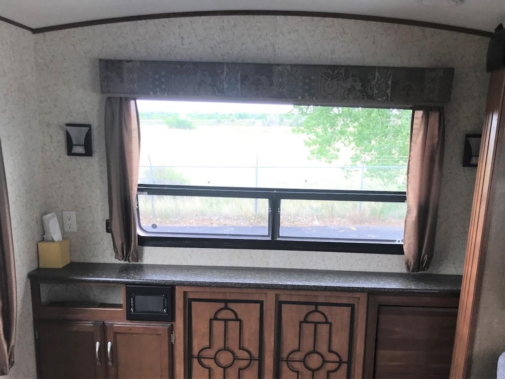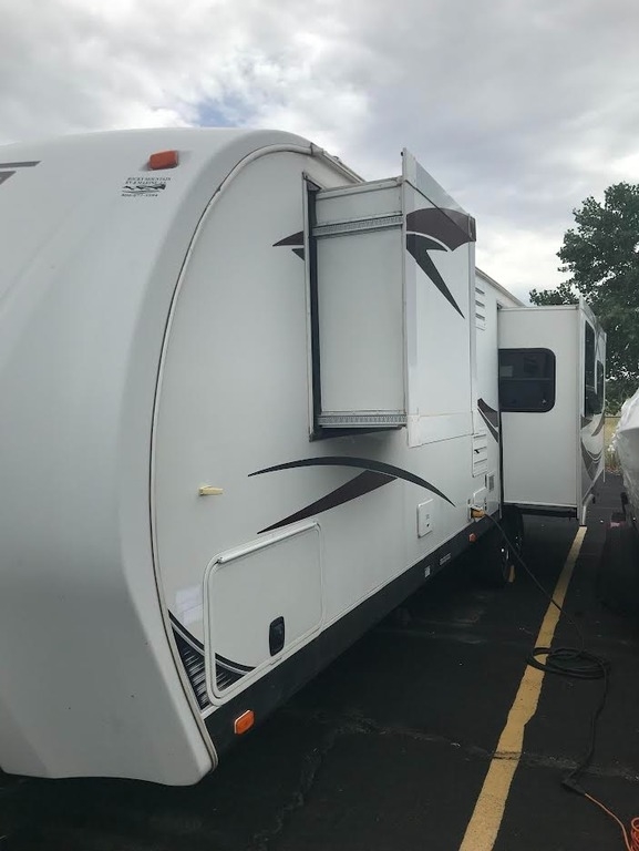 The trailer has an awning that is extended electrically, 3 waste tanks and one freshwater tanks, water hookup for city water and a 30-amp electric connection. The tv antenna is adjustable. There is a ladder on the rear of the box for roof access. The trailer is currently wired for one rear looking camera that provides sight along the right rear side of the trailer. The monitor and one additional camera will come with it. The trailer hitch is a Reese 12,000 lb. weight distribution hitch with a sway bar. There are two 30lb. propane tanks and two 12-volt marine batteries.
