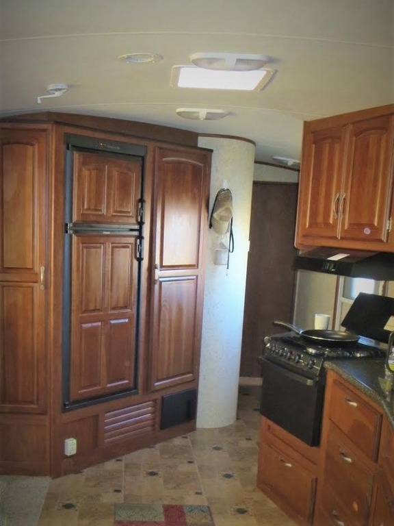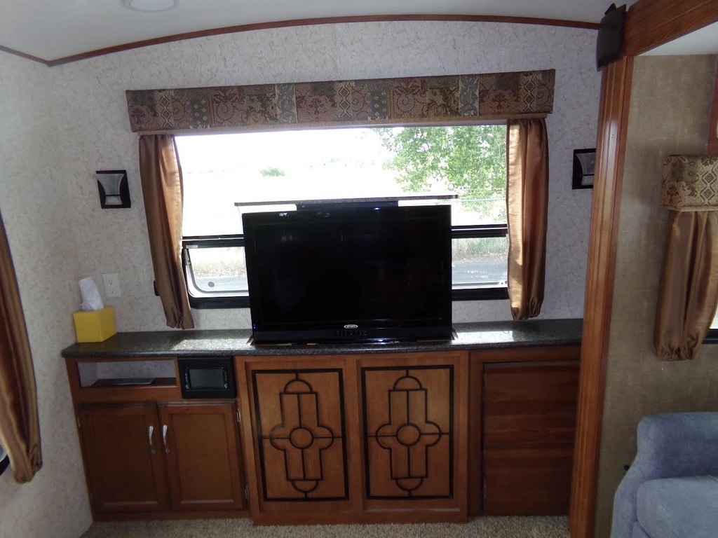 Living area has an entertainment center with a foldaway desk, a stow-away television, and media center. There are speakers in the living area, bedroom and outside that are all controlled by the media center. The tv is connected to antenna, is cable capable, and the media center will allow cd’s. A new queen-sized sofa bed adds comfortable seating and space for two guests to sleep. The living area has space for a large recliner if desired.